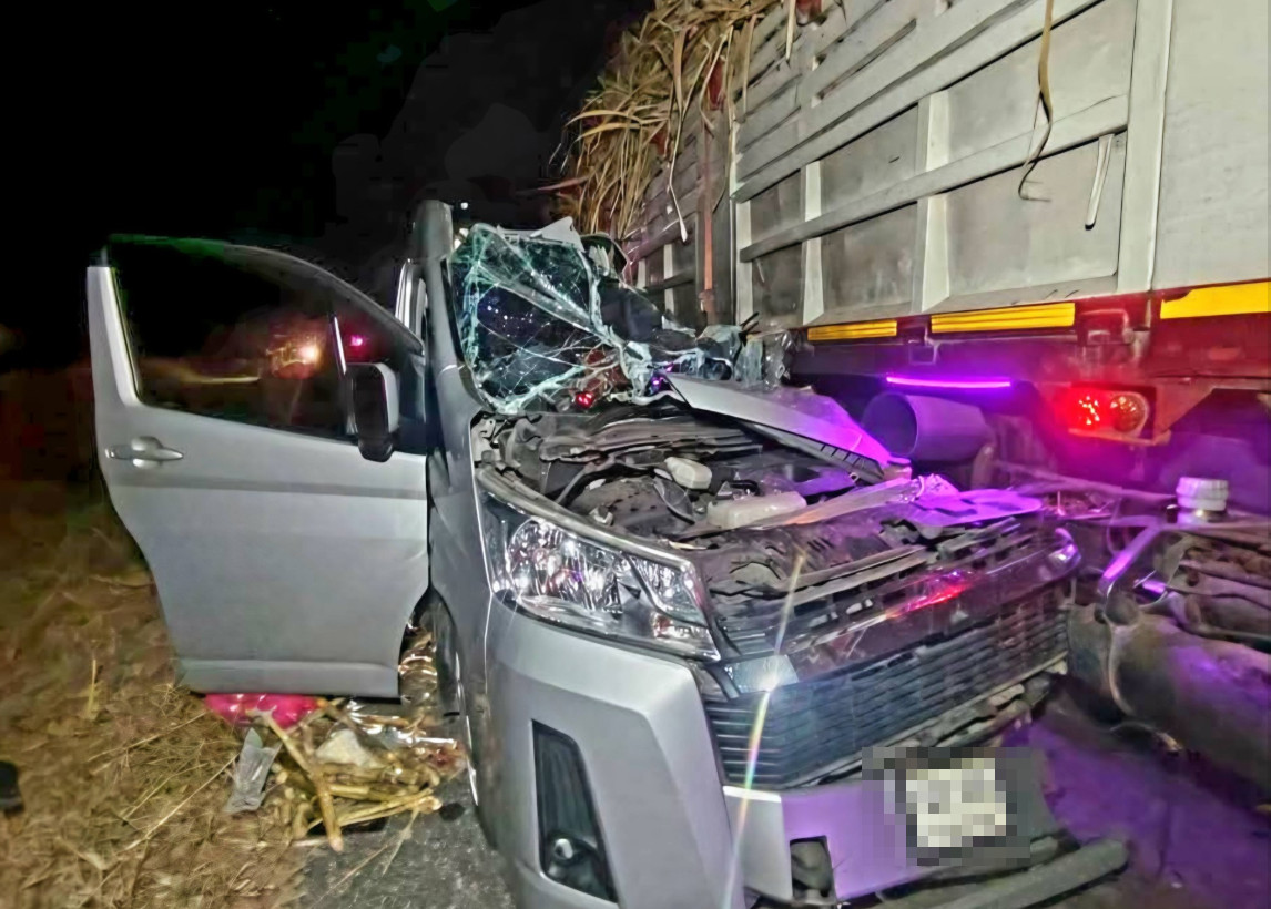 ในที่เกิดเหตุพบรถตู้โดยสาร โตโยต้า คอมมิวเตอร์ สีเทา ทะเบียนกรุงเทพมหานคร สภาพด้านหน้าพังยับเยิน มุดเข้าไปติดอยู่ใต้ท้ายรถบรรทุกอ้อย ยี่ห้อมิตซูบิชิ ฟูโซ่ ทะเบียนกาฬสินธุ์ ตรวจสอบเบื้องต้นพบผู้ได้รับบาดเจ็บ 2 ราย รายแรกเป็นชายอายุประมาณ 20 ปี มีอาการปวดต้นคอและต้นขาซ้ายผิดรูป เจ้าหน้าที่เร่งนำส่ง รพ.โพธิ์ชัย