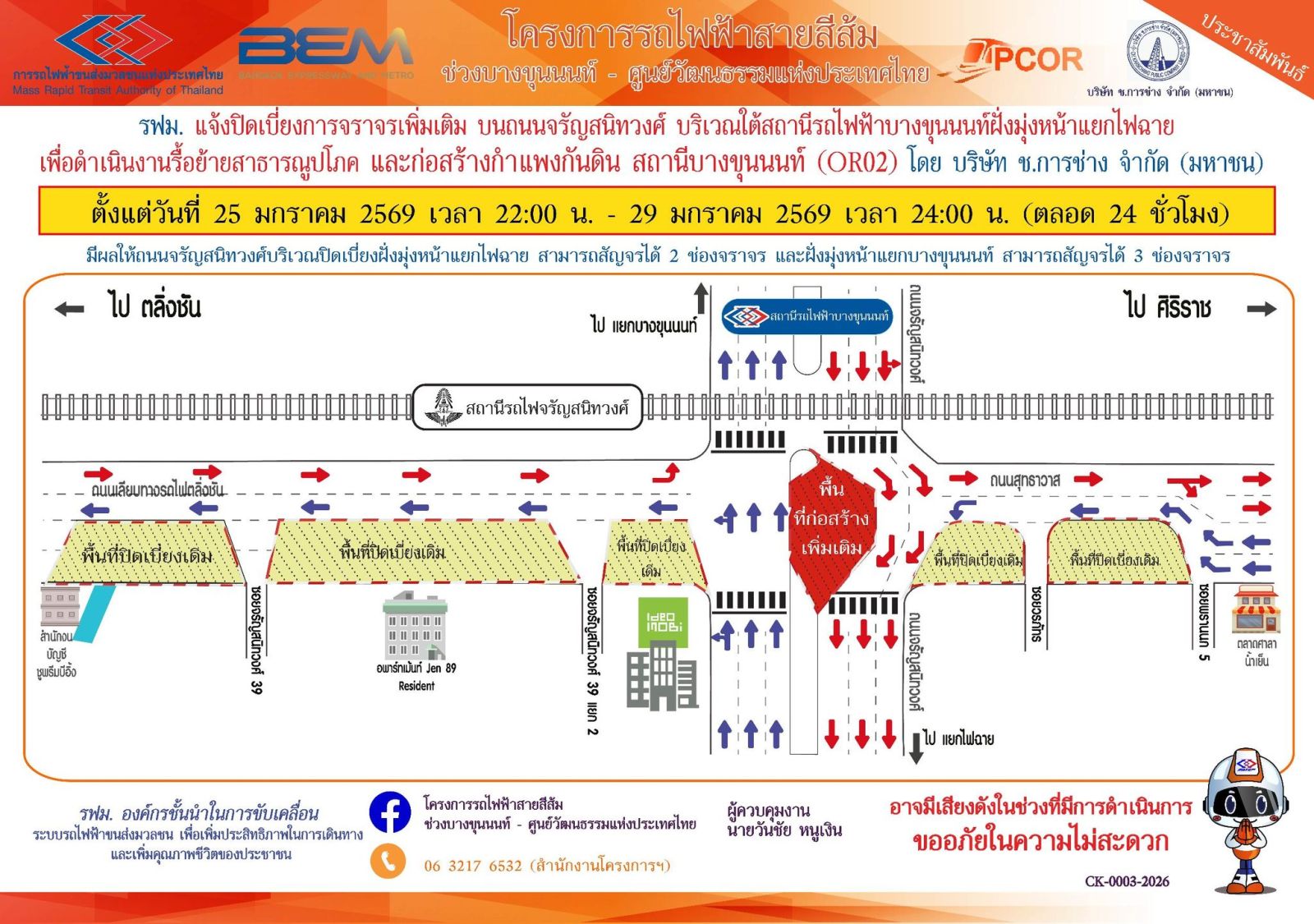 รฟม. แจ้งปิดเบี่ยงการจราจรเพิ่มเติม บนถนนจรัญสนิทวงศ์ บริเวณใต้สถานีรถไฟฟ้าบางขุนนนท์ ฝั่งมุ่งหน้าแยกไฟฉาย เพื่อดำเนินงานรื้อย้ายสาธารณูปโภค และก่อสร้างกำแพงกันดิน สถานีบางขุนนนท์ (OR02) โครงการรถไฟฟ้าสายสีส้ม ช่วงบางขุนนนท์ - ศูนย์วัฒนธรรมแห่งประเทศไทย ตั้งแต่วันที่ 25 มกราคม 2569 เวลา 22:00 น. – 29 มกราคม 2569 เวลา 24:00 น. (ตลอด 24 ชั่วโมง)