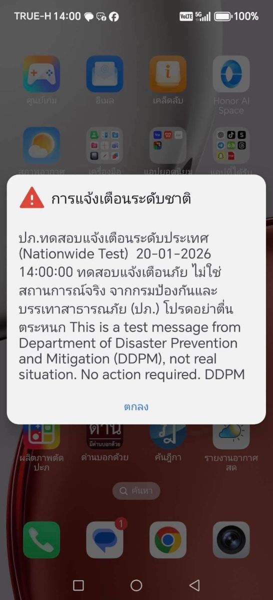 วันนี้ (20 ม.ค. 69) เวลา 14.00 น. ณ ห้องประชุม 1 ปภ. กรมป้องกันและบรรเทาสาธารณภัย ร่วมกับกระทรวงดิจิทัลเพื่อเศรษฐกิจและสังคม กสทช. และผู้ให้บริการเครือข่ายบริษัทโทรคมนาคมแห่งชาติ จำกัด (มหาชน) บริษัท ทรูคอร์ปอเรชั่น จำกัด (มหาชน) และบริษัท แอดวานซ์ อินโฟร์ เซอร์วิส จำกัด (มหาชน) ทดสอบระบบการแจ้งเตือนภัยผ่านสัญญาณโทรศัพท์เคลื่อนที่ (Cell Broadcast) ระดับประเทศ (Nationwide Test) โดยมีนายอรรษิษฐ์ สัมพันธรัตน์ ปลัดกระทรวงมหาดไทย เป็นประธานฯ พร้อมด้วยผู้แทนจากกระทรวงดิจิทัลเพื่อเศรษฐกิจและสังคม กสทช. กรมส่งเสริมการปกครองท้องถิ่น พร้อมทั้งหน่วยร่วมปฏิบัติงานห้องปฏิบัติการ (War Room) เพื่อการแจ้งเตือนภัยของชาติ ได้แก่ กรมอุตุนิยมวิทยา สำนักงานทรัพยากรน้ำแห่งชาติ กรมชลประทาน สำนักงานพัฒนาเทคโนโลยีอวกาศและภูมิสารสนเทศ (องค์การมหาชน) กรมทรัพยากรธรณี กรมทรัพยากรน้ำ สถาบันสารสนเทศทรัพยากรน้ำ กรมประชาชนสัมพันธ์ กรมควบคุมมลพิษ กรมควบคุมโรค สำนักงานตำรวจแห่งชาติ และผู้ว่าราชการจังหวัดทุกจังหวัด กรุงเทพมหานคร อำเภอ และองค์กรปกครองส่วนท้องถิ่น เข้าร่วมรับการทดสอบและติดตามผลผ่านระบบอิเล็กทรอนิกส์ ณ ที่ตั้งในพื้นที่