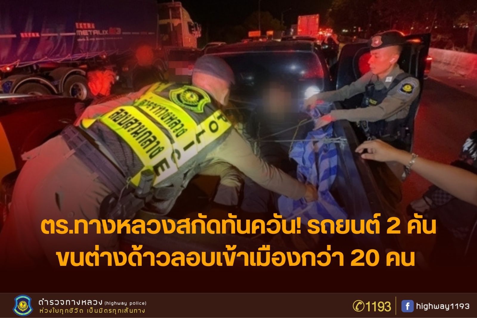 ตำรวจทางหลวงกองกำกับการ1 ไล่ติดตามรถกระบะต้องสงสัย 2 คัน หลังเปลี่ยนช่องทางกะทันหัน ใช้ความเร็วสูง ติดฟิล์มมืดทึบและคลุมผ้าใบท้ายรถ บนถนนสายเอเชีย จ.อ่างทอง ก่อนสั่งหยุดตรวจ ตรวจค้นพบแรงงานต่างด้าวหลบหนีเข้าเมืองอยู่ในรถ 2 คัน รวมกว่า 20 คน ไม่มีหนังสือเดินทาง