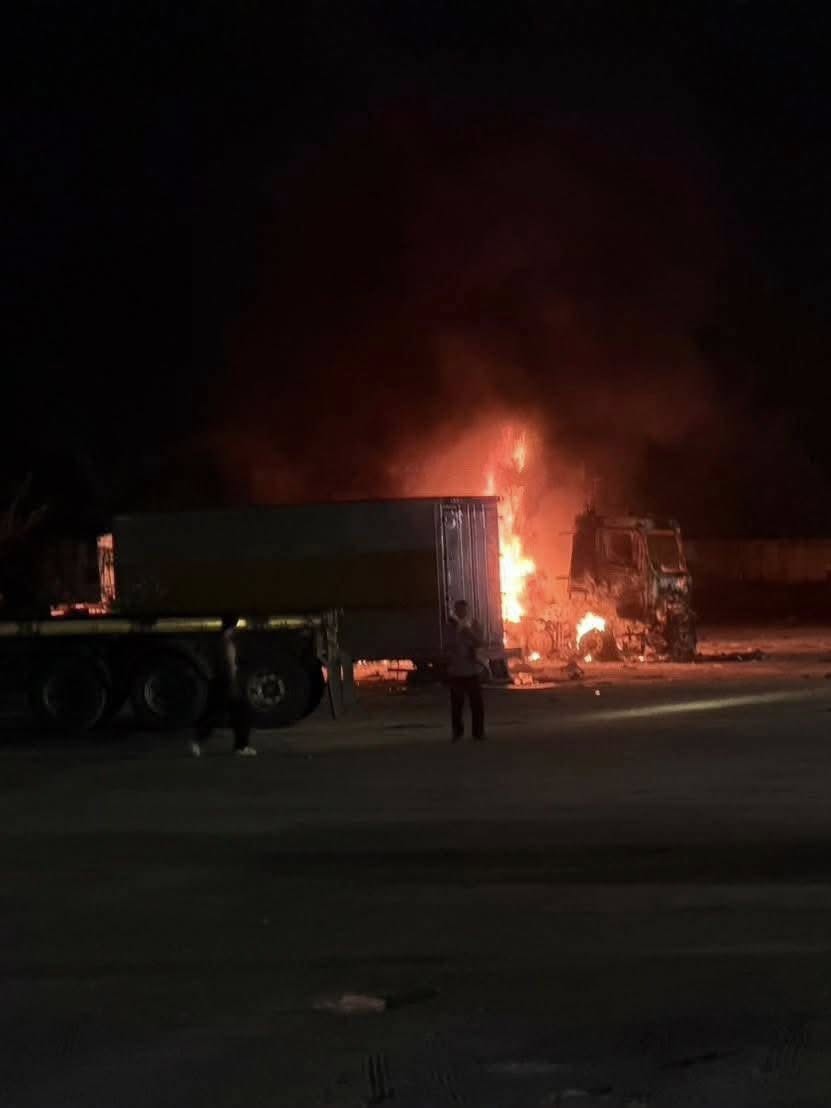 ภายหลังรับแจ้งเจ้าหน้าที่ตำรวจจึงเข้าตรวจสอบที่เกิดเหตุ จากการตรวจสอบเบื้องต้น ในที่เกิดเหตุพบเพลิงกำลังลุกไหม้ส่วนหัวลากของรถบรรทุกพ่วงอย่างรุนแรง