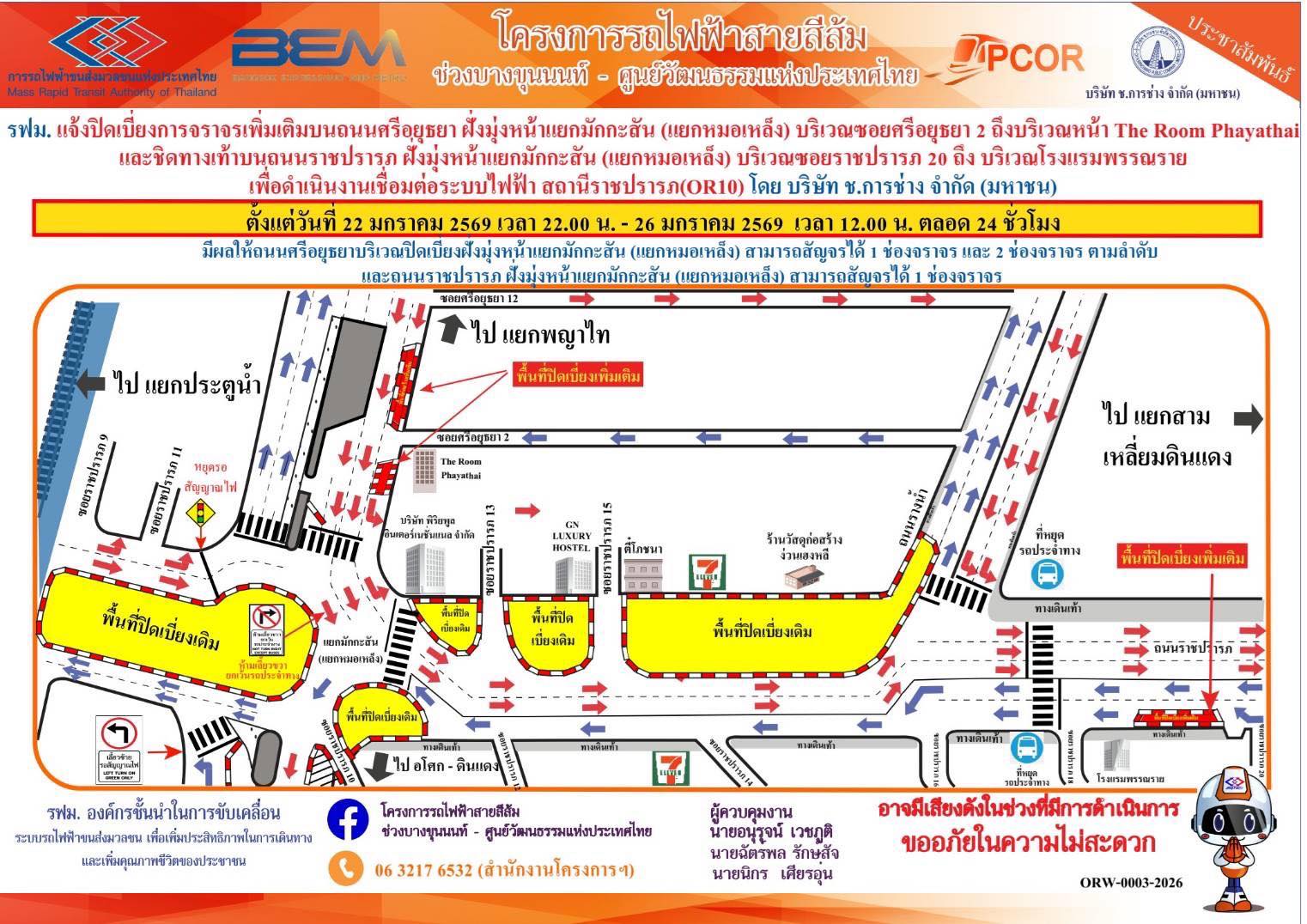 รฟม. แจ้งปิดเบี่ยงจราจรเพิ่มเติมชิดทางเท้า 1 ช่องจราจร บนถนนศรีอยุธยา ฝั่งมุ่งหน้าแยกมักกะสัน (แยกหมอเหล็ง) บริเวณซอยศรีอยุธยา 2 ถึงบริเวณหน้า The Room Phayathai และชิดทางเท้า 1 ช่องจราจร บนถนนราชปรารภ ฝั่งมุ่งหน้าแยกมักกะสัน (แยกหมอเหล็ง) บริเวณซอยราชปรารภ 20 ถึง บริเวณโรงแรมพรรณราย เพื่อดำเนินงานเชื่อมต่อระบบไฟฟ้า สถานีราชปรารภ (OR10) โครงการรถไฟฟ้าสายสีส้ม ช่วงบางขุนนนท์ – ศูนย์วัฒนธรรมแห่งประเทศไทย ตั้งงแต่วันที่ 22 มกราคม 2569 เวลา 22.00 น. – 26 มกราคม 2569 เวลา 12.00 น. ตลอด 24 ชั่วโมง