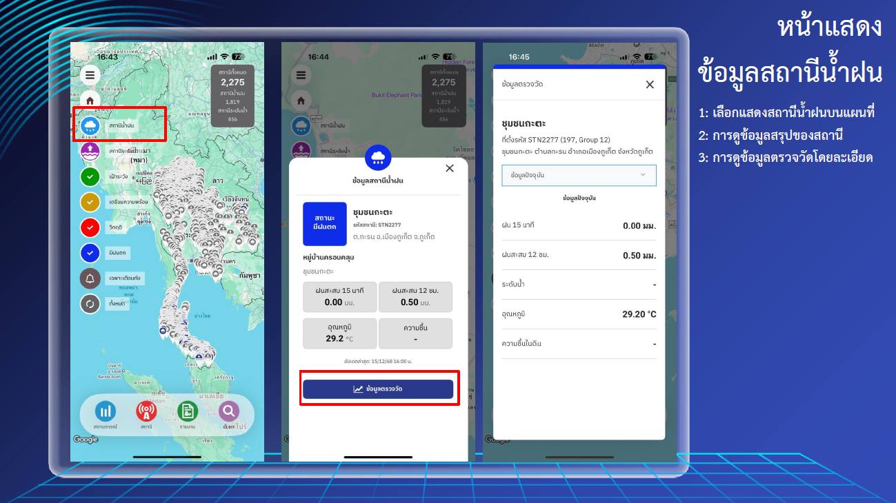 • เช็กสถานะได้ทันที: แสดงระดับน้ำและปริมาณฝนสะสมแบบเรียลไทม์ผ่านแผนที่