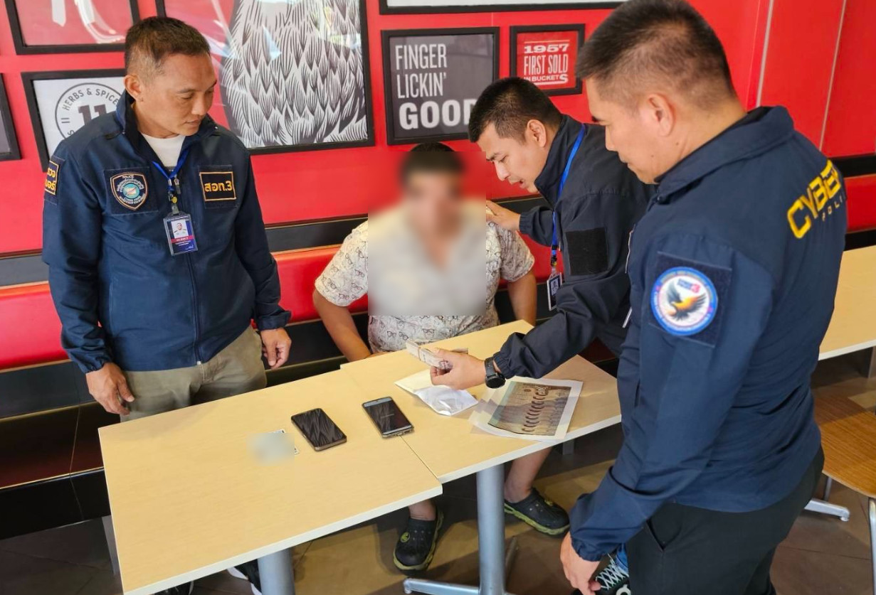 เมื่อถึงวันเวลาตามที่นัดหมาย เจ้าหน้าที่ตำรวจชุดจับกุมได้วางกำลังโดยรอบบริเวณร้านอาหารฟาสต์ฟู๊ดแห่งหนึ่ง ในพื้นที่ถนนทหาร ต.หมากแข้ง อ.เมืองอุดรธานี จ.อุดรธานี จากนั้นเจ้าหน้าที่ที่ปลอมตัวได้เข้าไปติดต่อรับมอบโทรศัพท์มือถือจำนวน 2 เครื่อง ซึ่งเข้าระบบ Mobile Banking ของบัญชีม้าไว้ จำนวน 5 บัญชี แล้วได้ส่งมอบเงินสด ล่อซื้อที่ได้ลงบันทึกประจำวันไว้แล้ว จำนวน 80,000 บาท เมื่อส่งมอบเงินสดสำเร็จ เจ้าหน้าที่ตำรวจชุดจับกุมจึงได้แสดงตัวเข้าจับกุมผู้ต้องหารายดังกล่าว