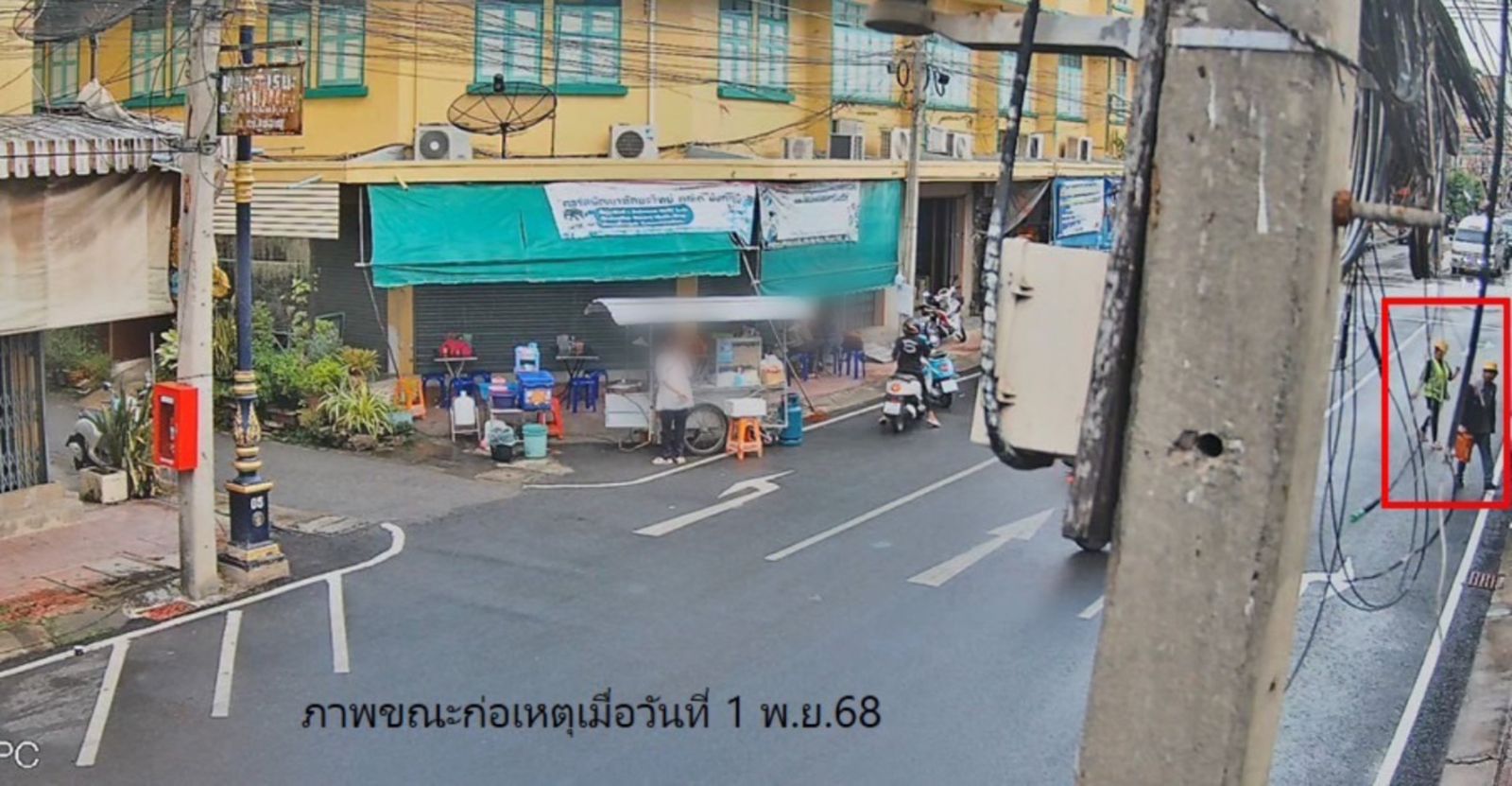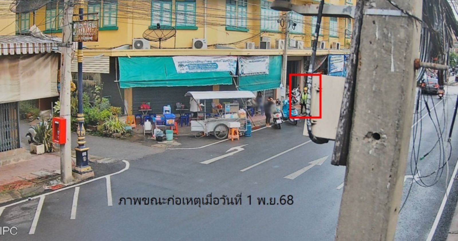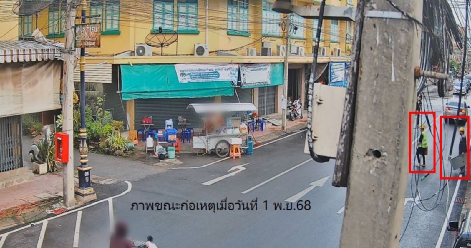 จากการตรวจสอบกล้องวงจรปิดพบว่า เมื่อวันที่ 1 พ.ย.68 เวลาประมาณ 14.00 - 15.00 น. ได้มีชายหญิงคู่หนึ่งแต่งกายชุดพนักงานบริษัทบริษัทโทรคมนาคมแห่งชาติ (Nt) ขับรถยนต์เก๋งสีขาวมาจอดฝั่งตรงข้ามที่เกิดเหตุ