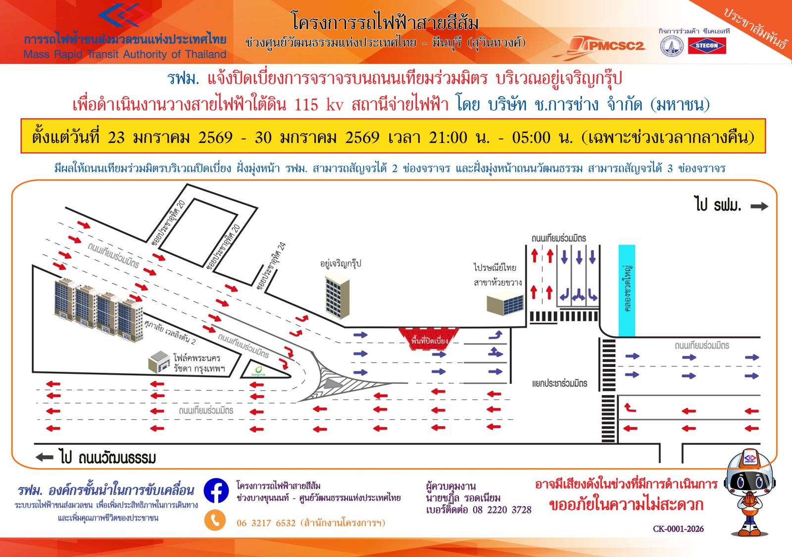 ประชาสัมพันธ์ แจ้งปิดเบี่ยงการจราจรบนถนนเทียมร่วมมิตร บริเวณอยู่เจริญกรุ๊ป เพื่อดำเนินงานวางสายไฟฟ้าใต้ดิน 115 kv สถานีจ่ายไฟฟ้าโครงการรถไฟฟ้าสายสีส้ม ช่วงศูนย์วัฒนธรรมแห่งประเทศไทย - มีนบุรี (สุวินทวงศ์) ตั้งแต่วันที่ 23 มกราคม 2569 – 6 กุมภาพันธ์ 2569 เวลา 21:00 น. – 05:00 น. (เฉพาะช่วงเวลากลางคืน) มีรายละเอียดดังนี้