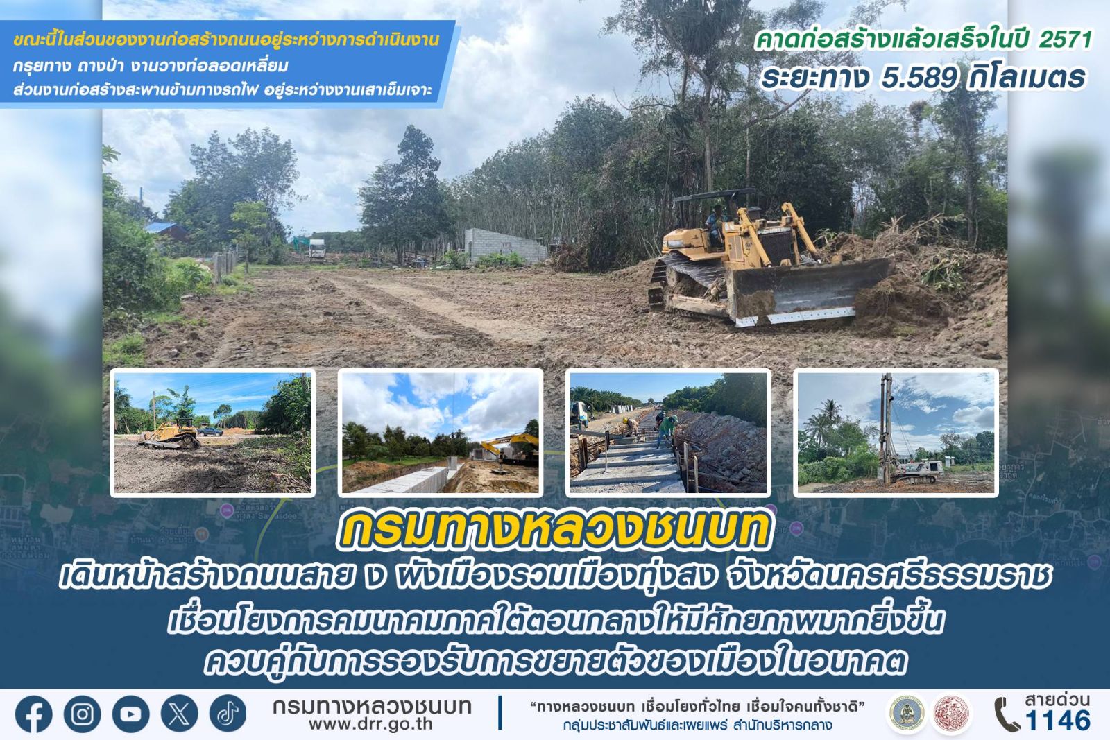 นายพิชิต หุ่นศิริ อธิบดีกรมทางหลวงชนบท เปิดเผยว่า ปัจจุบันกรมทางหลวงชนบท (ทช.) ได้ดำเนินโครงการก่อสร้างถนนสาย ง ผังเมืองรวมเมืองทุ่งสง จังหวัดนครศรีธรรมราช เพื่อเชื่อมโยงโครงข่ายการคมนาคมของจังหวัดให้มีศักยภาพมากยิ่งขึ้น ช่วยแก้ไขปัญหาการจราจรติดขัดในเขตเมือง รองรับการขยายตัวของเมืองในอนาคต พร้อมส่งเสริมเศรษฐกิจการขนส่ง การท่องเที่ยว และเป็นการพัฒนาด้านที่อยู่อาศัย ด้านพาณิชยกรรมพื้นที่บริเวณโดยรอบให้ประชาชนมีคุณภาพชีวิตที่ดีมากยิ่งขึ้น ซึ่งปัจจุบันการก่อสร้างมีความคืบหน้าไปแล้วกว่าร้อยละ 8 ขณะนี้ในส่วนของงานก่อสร้างถนนอยู่ระหว่างการดำเนินงานกรุยทาง ถางป่า งานวางท่อลอดเหลี่ยม ส่วนงานก่อสร้างสะพานข้ามทางรถไฟนั้น อยู่ระหว่างงานเสาเข็มเจาะ โดยโครงการดังกล่าวคาดว่าจะแล้วเสร็จสมบูรณ์ในปี 2571 ต่อไป