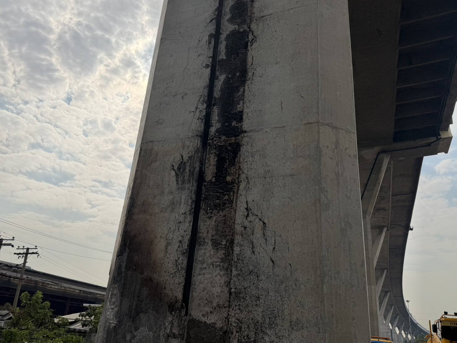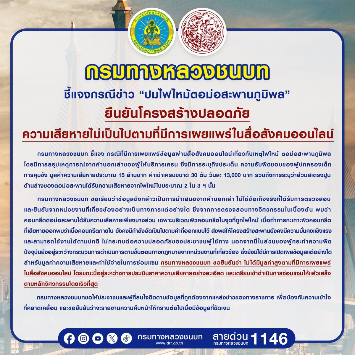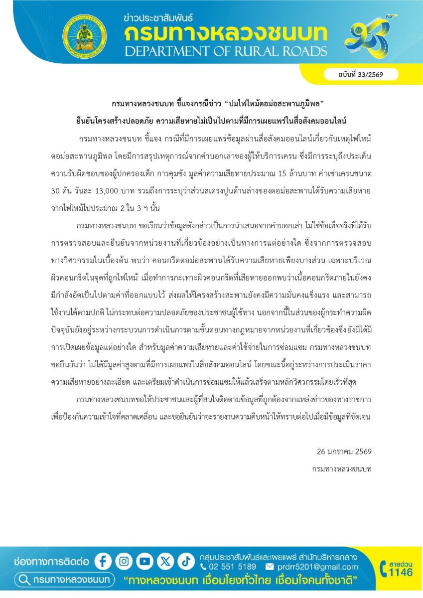กรมทางหลวงชนบท ขอเรียนว่าข้อมูลดังกล่าวเป็นการนำเสนอจากคำบอกเล่า ไม่ใช่ข้อเท็จจริงที่ได้รับการตรวจสอบและยืนยันจากหน่วยงานที่เกี่ยวข้องอย่างเป็นทางการแต่อย่างใด ซึ่งจากการตรวจสอบทางวิศวกรรมในเบื้องต้น พบว่า คอนกรีตตอม่อสะพานได้รับความเสียหายเพียงบางส่วน เฉพาะบริเวณผิวคอนกรีตในจุดที่ถูกไฟไหม้ เมื่อทำการกะเทาะผิวคอนกรีตที่เสียหายออกพบว่าเนื้อคอนกรีตภายในยังคงมีกำลังอัดเป็นไปตามค่าที่ออกแบบไว้ ส่งผลให้โครงสร้างสะพานยังคงมีความมั่นคงแข็งแรง และสามารถใช้งานได้ตามปกติ ไม่กระทบต่อความปลอดภัยของประชาชนผู้ใช้ทาง นอกจากนี้ในส่วนของผู้กระทำความผิด ปัจจุบันยังอยู่ระหว่างกระบวนการดำเนินการตามขั้นตอนทางกฎหมายจากหน่วยงานที่เกี่ยวข้องซึ่งยังมิได้มีการเปิดเผยข้อมูลแต่อย่างใด สำหรับมูลค่าความเสียหายและค่าใช้จ่ายในการซ่อมแซม กรมทางหลวงชนบท ขอยืนยันว่า ไม่ได้มีมูลค่าสูงตามที่มีการเผยแพร่ในสื่อสังคมออนไลน์ โดยขณะนี้อยู่ระหว่างการประเมินราคาความเสียหายอย่างละเอียด และเตรียมเข้าดำเนินการซ่อมแซมให้แล้วเสร็จตามหลักวิศวกรรมโดยเร็วที่สุด