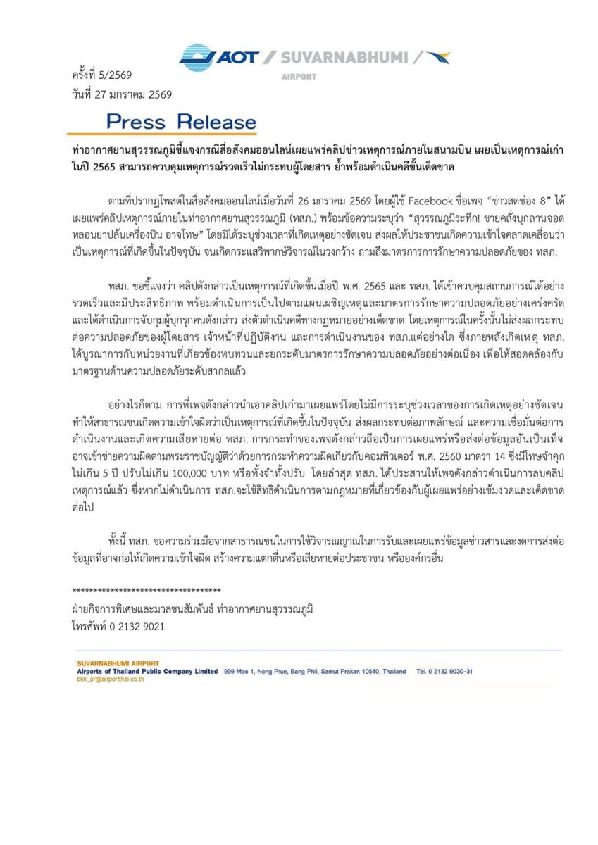 ตามที่ปรากฏโพสต์ในสื่อสังคมออนไลน์เมื่อวันที่ 26 มกราคม 2569 โดยผู้ใช้Facebook ชื่อเพจ “ข่าวสดช่อง 8” ได้เผยแพร่คลิปเหตุการณ์ภายในท่าอากาศยานสุวรรณภูมิ (ทสภ.) พร้อมข้อความระบุว่า “สุวรรณภูมิระทึก! ชายคลั่งบุกลานจอด หลอนยาปล้นเครื่องบิน อาจโทษ” โดยมิได้ระบุช่วงเวลาที่เกิดเหตุอย่างชัดเจน ส่งผลให้ประชาชนเกิดความเข้าใจคลาดเคลื่อนว่าเป็นเหตุการณ์ที่เกิดขึ้นในปัจจุบัน จนเกิดกระแสวิพากษ์วิจารณ์ในวงกว้าง ถามถึงมาตรการการรักษาความปลอดภัยของ ทสภ.