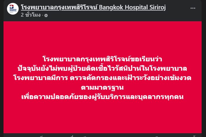 ขณะที่ ทางเพจ โรงพยาบาลกรุงเทพสิริโรจน์ ชี้แจงว่า "โรงพยาบาลกรุงเทพสิริโรจน์ขอเรียนว่า ปัจจุบันยังไม่พบผู้ป่วยติดเชื้อไวรัสนิปาห์ในโรงพยาบาล โรงพยาบาลมีการตรวจคัดกรองและเฝ้าระวังอย่างเข้มงวดตามมาตรฐาน เพื่อความปลอดภัยของผู้รับบริการและบุคลากรทุกคน" และมีการออกประกาศ ระบุว่า "ประกาศจากโรงพยาบาลกรุงเทพสิริโรจน์