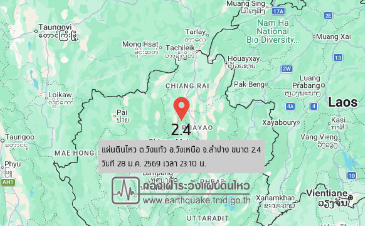 แผ่นดินไหว ขนาด 2.4 ภายในพื้นที่ อำเภอวังเหนือ จังหวัดลำปาง