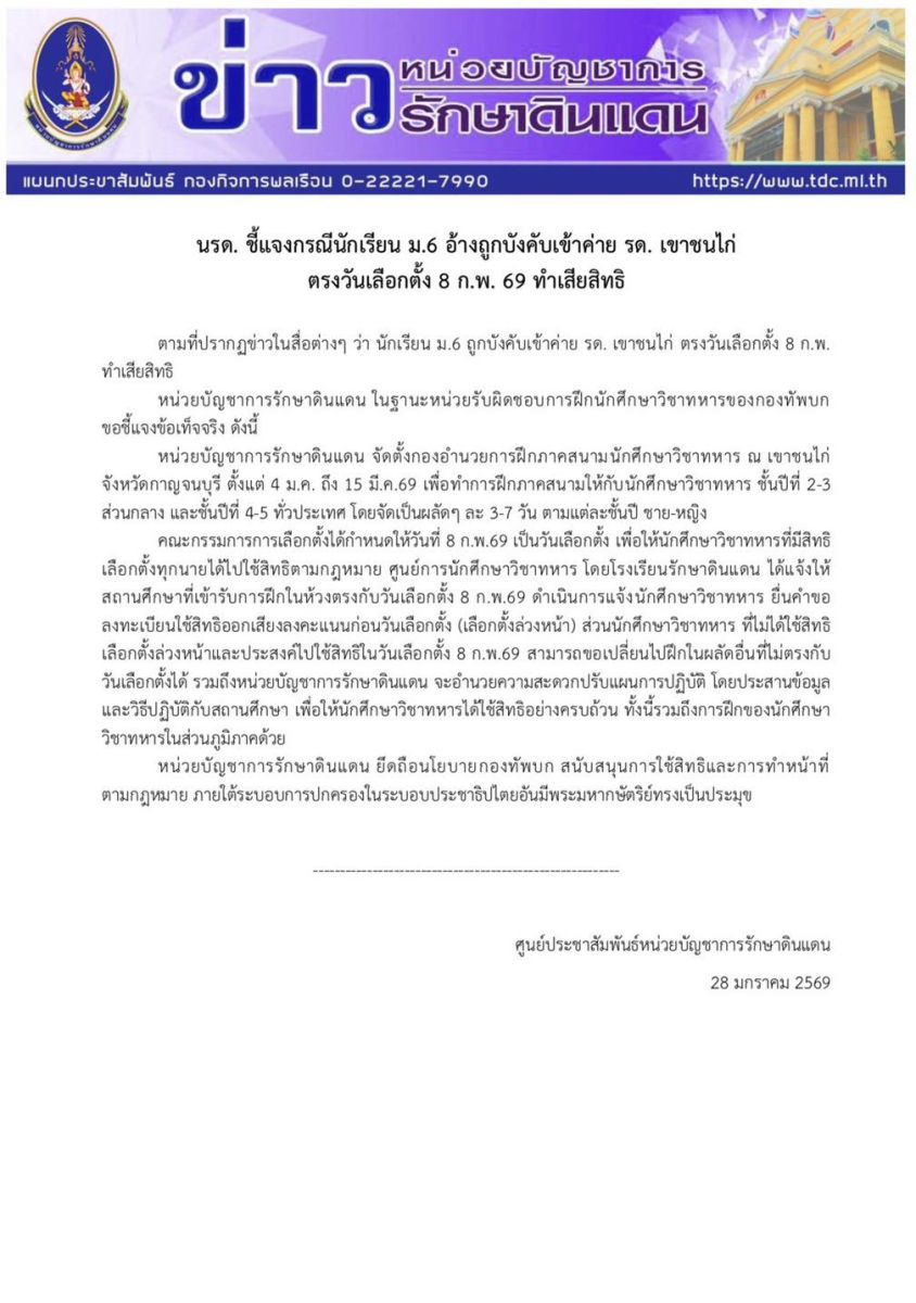 ตามที่ปรากฏข่าวในสื่อต่างๆ ว่า นักเรียน ม.6 ถูกบังคับเข้าค่าย รด. เขาชนไก่ ตรงวันเลือกตั้ง 8 ก.พ. ทำเสียสิทธิ
