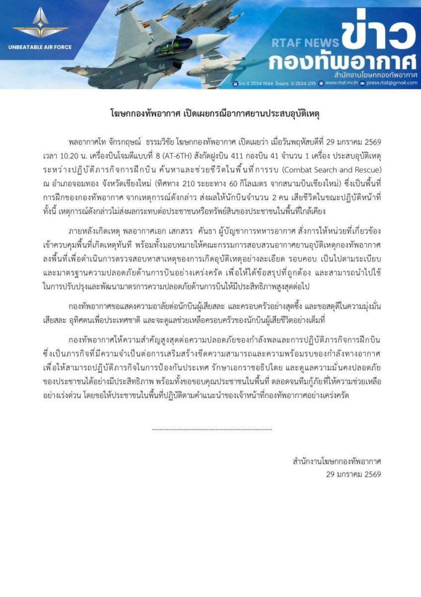 พลอากาศโท จักรกฤษณ์ ธรรมวิชัย โฆษกกองทัพอากาศ เปิดเผยว่า เมื่อวันพฤหัสบดีที่ 29 มกราคม 2569 เวลา 10.20 น. เครื่องบินโจมตีแบบที่ 8 (AT-6TH) สังกัดฝูงบิน 411 กองบิน 41 จำนวน 1 เครื่อง ประสบอุบัติเหตุระหว่างปฏิบัติภารกิจการฝึกบิน ค้นหาและช่วยชีวิตในพื้นที่การรบ (Combat Search and Rescue) ณ อำเภอจอมทอง จังหวัดเชียงใหม่ (ทิศทาง 210 ระยะทาง 60 กิโลเมตร จากสนามบินเชียงใหม่) ซึ่งเป็นพื้นที่การฝึกของกองทัพอากาศ จากเหตุการณ์ดังกล่าว ส่งผลให้นักบินจำนวน 2 คน เสียชีวิตในขณะปฏิบัติหน้าที่ ทั้งนี้ เหตุการณ์ดังกล่าวไม่ส่งผลกระทบต่อประชาชนหรือทรัพย์สินของประชาชนในพื้นที่ใกล้เคียง