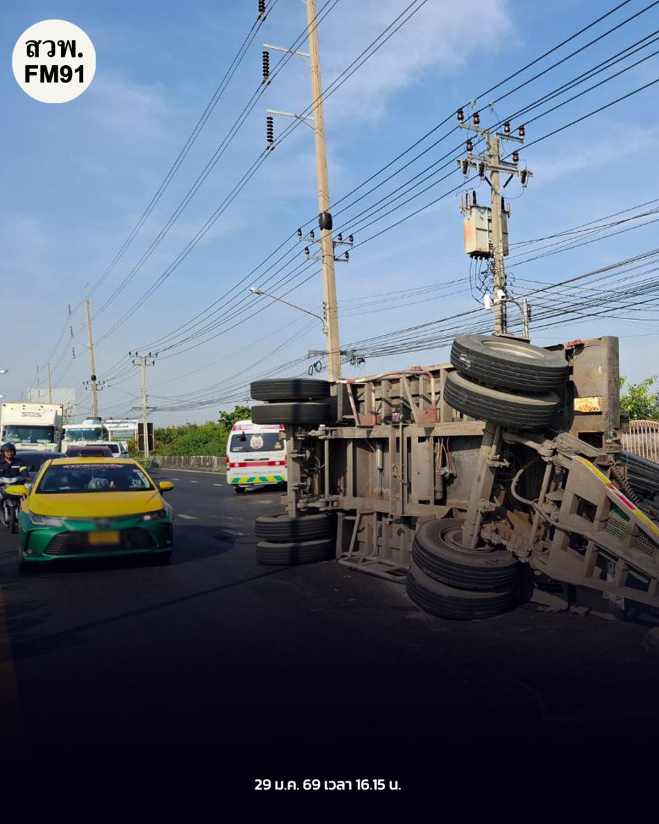 29 ม.ค. 69 เวลา 15.45 น. เลี่ยง! แยกคลองขุด ถ.ตำหรุ-บางพลี มุ่งหน้า แยกคลอง 9 กรณีรถพ่วงบรรทุกเหล็กพลิกตะแคง กีดขวางจราจร บริเวณจุดกลับรถ กม.7