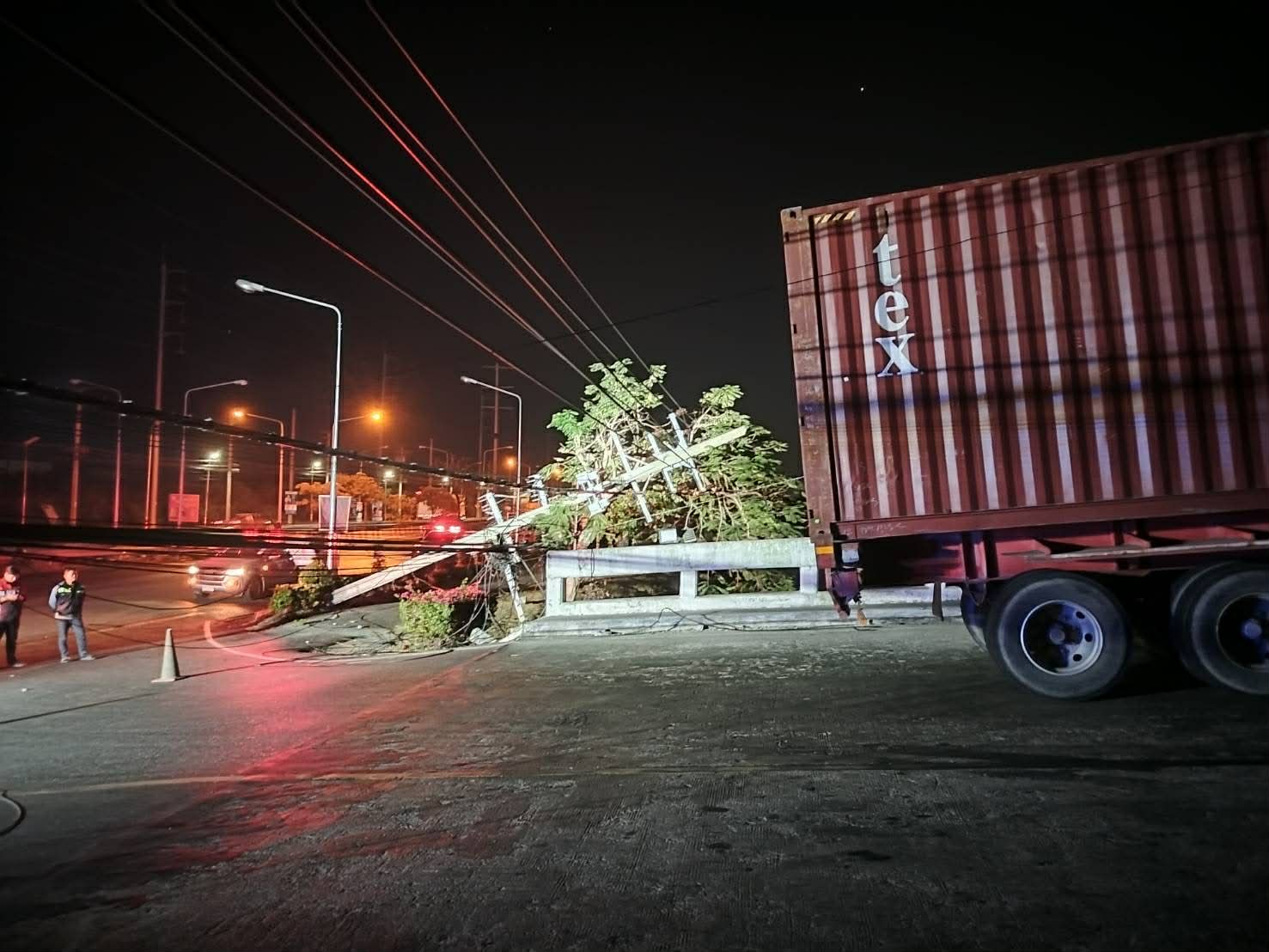 MEA ได้รับแจ้งเหตุรถบรรทุกพ่วงตู้คอนเทนเนอร์เกี่ยวสายสื่อสาร ส่งผลให้เสาไฟฟ้าล้มเป็นจำนวนมาก ไฟฟ้าดับเป็นบริเวณกว้าง บริเวณ ถ.สุขุมวิทตั้งแต่ปากซอยทีเจซี ถึงทางเข้านิคมอุตสาหกรรมบางปู ระยะทางประมาณ 1.5 กม. MEA เร่งระดม จนท. ลงพื้นที่แก้ไข ขออภัยในความไม่สะดวกมา ณ ที่นี้