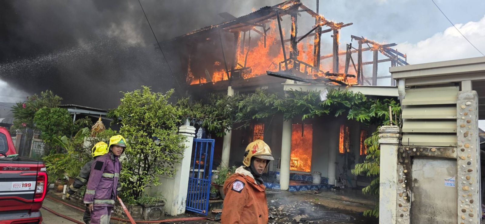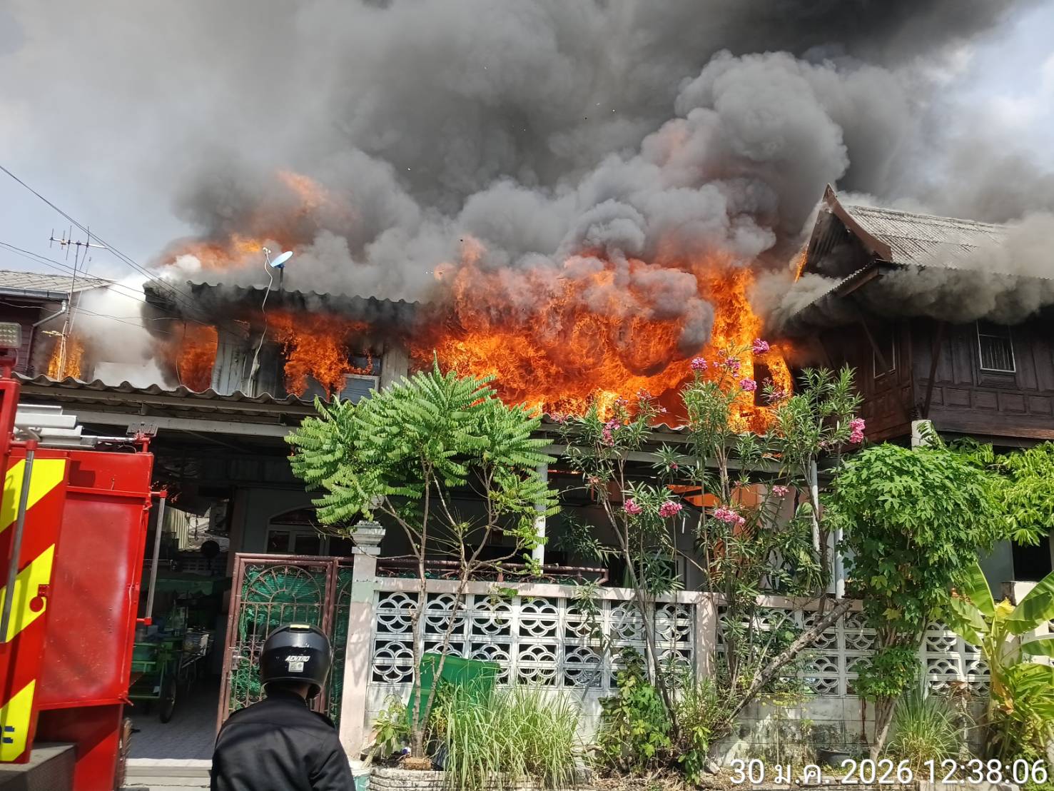 เวลา 12.42 น. ขณะนี้เพลิงลุกไหม้เสียหายแล้วจำนวน 2 หลังคาเรือน อยู่ระหว่างเร่งรัดป้องกันการติดต่อลุกลาม