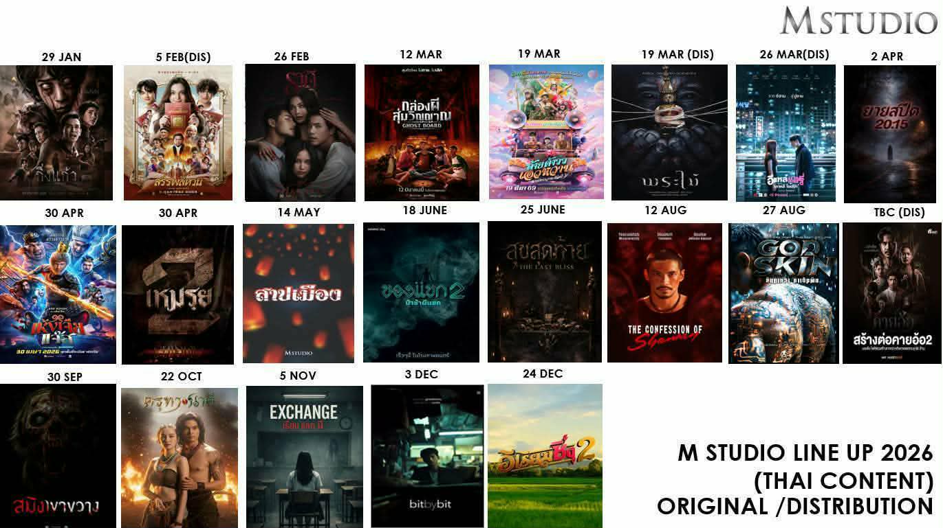 M STUDIO ตอกย้ำความเป็น “เจ้าตลาดตัวจริง” ของวงการภาพยนตร์ไทย หลังครองแชมป์รายได้ Box Office หนังไทยสูงสุดต่อเนื่อง 3 ปีซ้อน พร้อมกวาดส่วนแบ่งตลาดมากกว่า 60% ก่อนประกาศไลน์อัปปี 2569 แบบไม่ไว้หน้าใคร จัดหนัก 17 เรื่อง ครบทุกแนว โดยเฉพาะ “หนังผี” ที่เตรียมครองตลาดแบบเบ็ดเสร็จ