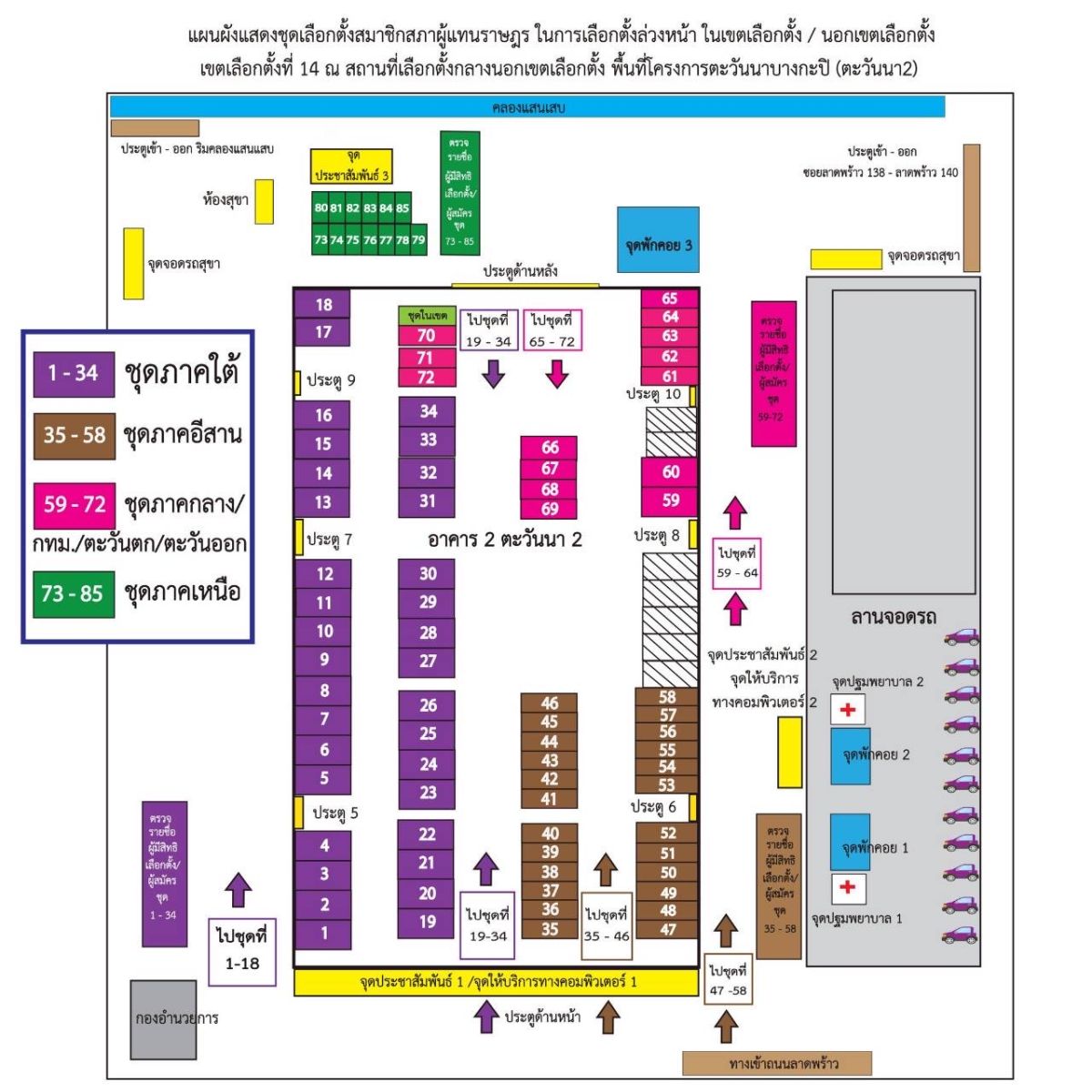 นางสิริกาญจน์ สุยวณิชย์ ผู้อำนวยการเขตบางกะปิ ได้เปิดเผยว่า สำหรับเขตบางกะปิมีประชาชนลงทะเบียนใช้สิทธิ์เลือกตั้งล่วงหน้าและนอกเขตสูงที่สุดใน กทม. โดยสถานที่โครงการตะวันนา 2 แบ่งออกเป็น 4 ภาค คือ เหนือ กลาง อีสาน ใต้ พร้อมกับจำแนกสีของแต่ละภาค เพื่อไม่ให้ประชาชนเกิดความสับสน โดยมีแผนผังให้ประชาชนได้ดูก่อนเข้าคูหา ซึ่งภาคใต้มีประชาชนที่ลงทะเบียนเลือกตั้งล่วงหน้ามากที่สุด