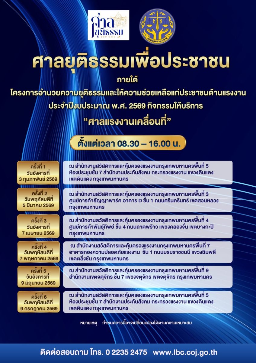 ศาลแรงงานกลางจัดโครงการศาลยุติธรรมเพื่อประชาชน ภายใต้กิจกรรมอำนวยความยุติธรรมและให้ความช่วยเหลือด้านแรงงาน ประจำปีงบประมาณ 2569 ในกิจกรรมศาลแรงงานเคลื่อนที่
