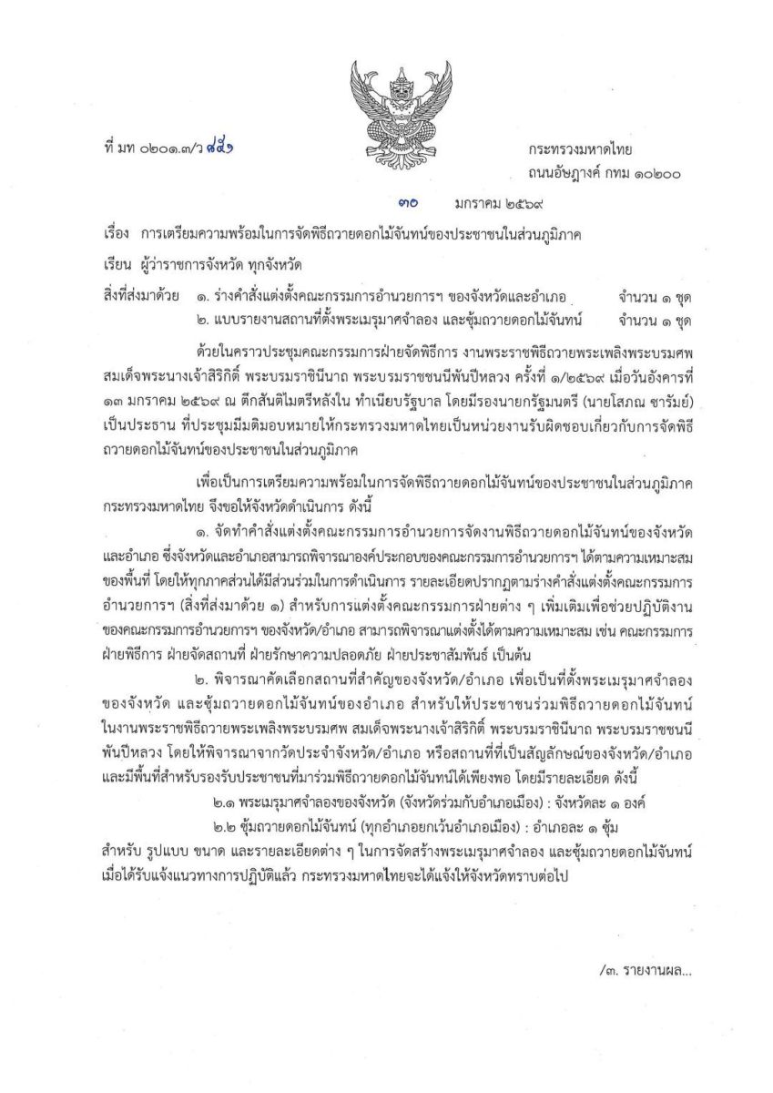 ก.มหาดไทย แจ้งทุกจังหวัดทั่วประเทศ เตรียมความพร้อมพิธีถวายดอกไม้จันทน์ในงานพระราชพิธีถวายพระเพลิงพระบรมศพ สมเด็จพระนางเจ้าสิริกิติ์ พระบรมราชินีนาถ พระบรมราชชนนีพันปีหลวง ของประชาชนในส่วนภูมิภาค