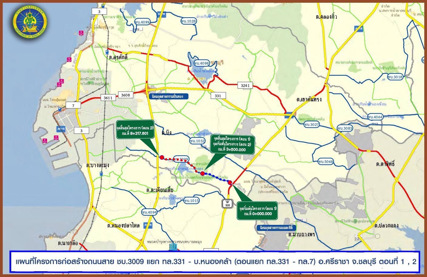 นายพิชิต หุ่นศิริ อธิบดีกรมทางหลวงชนบท เปิดเผยว่า กรมทางหลวงชนบท (ทช.) ได้ดำเนินโครงการก่อสร้างถนนทางหลวงชนบทสาย ชบ.3009 แยก ทล.331 - บ้านหนองคล้า (ตอนแยก ทล.331 - ทล.7) อำเภอศรีราชา จังหวัดชลบุรี เพื่อยกระดับโครงข่ายทางหลวงชนบทให้มีความสมบูรณ์ รองรับการขยายตัวของพื้นที่นิคมอุตสาหกรรม เชื่อมต่อการเดินทางขนส่งไปยังท่าเรือแหลมฉบัง เพิ่มความสะดวกรวดเร็วปลอดภัยในด้านการคมนาคมขนส่ง โดยโครงการดังกล่าวคาดว่าจะก่อสร้างแล้วเสร็จในปี 2570 ซึ่งแบ่งการดำเนินงานเป็น 2 ตอน ดังนี้