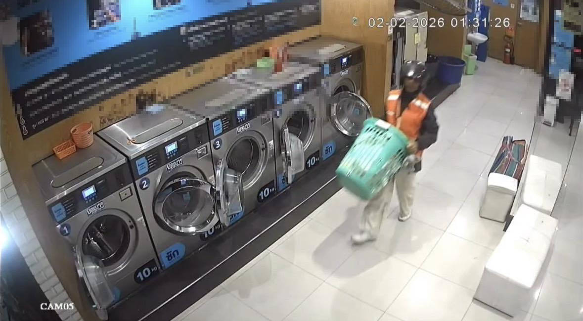 เหตุการณ์ดังกล่าวเกิดขึ้นเมื่อเวลา 01.31 น. วันที่ 2 กุมภาพันธ์ 2569 โดยผู้เสียหายมีหลักฐานเป็นภาพจากกล้องวงจรปิด ซึ่งสามารถบันทึกพฤติกรรมของคนร้ายไว้ได้อย่างชัดเจน จากการตรวจสอบภาพ พบคนร้ายเป็นชายไทย สวมเสื้อวินจักรยานยนต์สีส้ม ด้านหลังสกรีนข้อความ สวมกางเกงขายาว รองเท้าผ้าใบ สะพายกระเป๋าสีน้ำตาล และสวมหมวกกันน็อกเต็มใบสีดำคาดขาว ทำทีถือตะกร้าผ้าเดินเข้ามาภายในร้านเหมือนลูกค้าทั่วไป ก่อนจะมุ่งตรงไปยังเครื่องอบผ้าแห้งที่ผู้เสียหายใช้งานอยู่