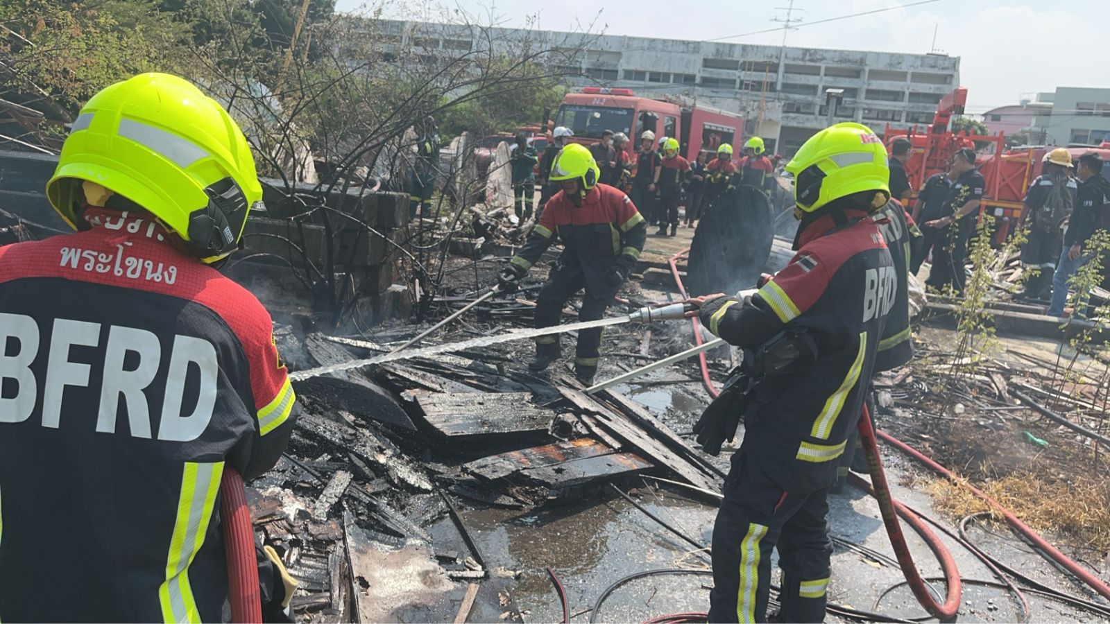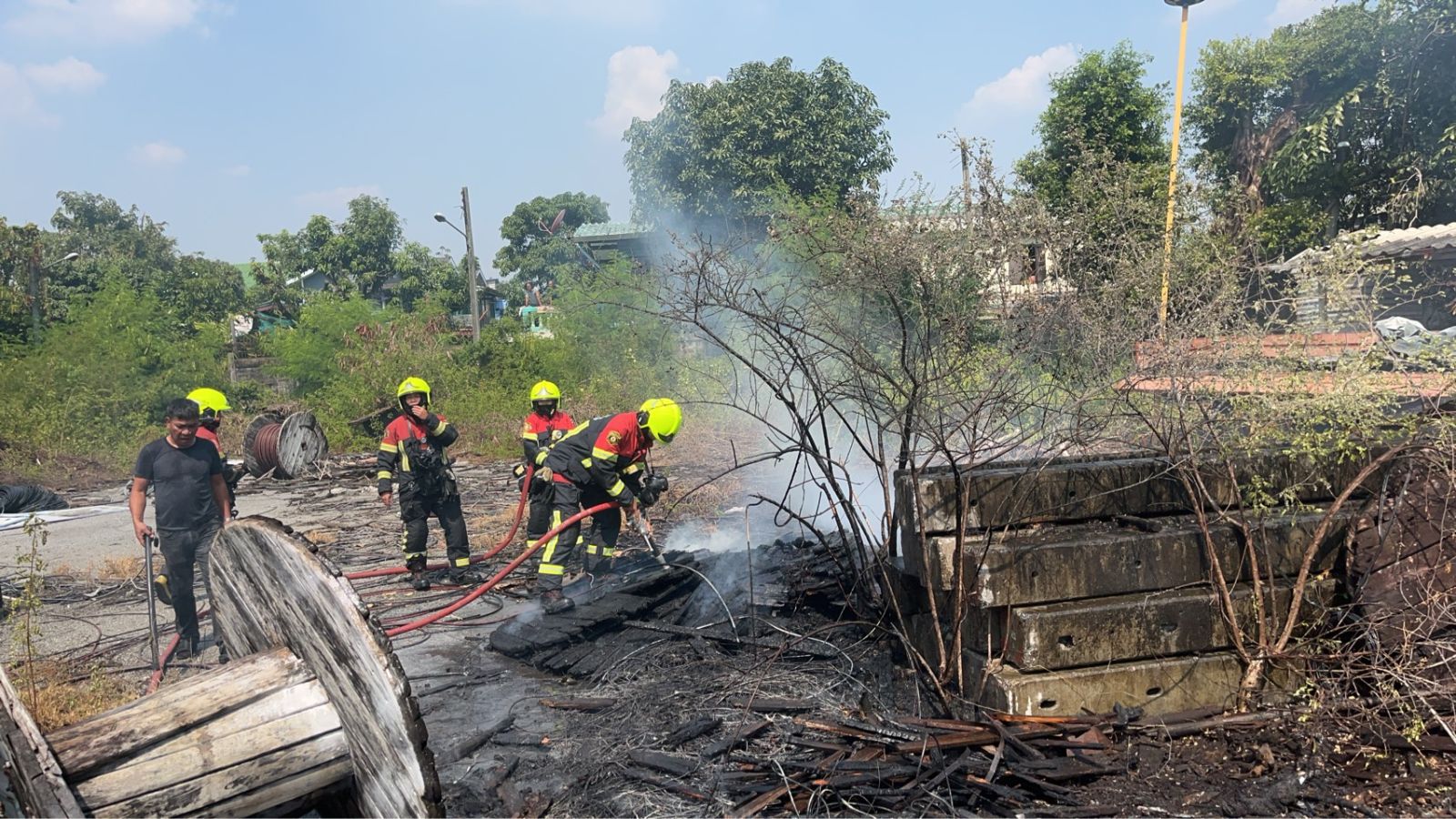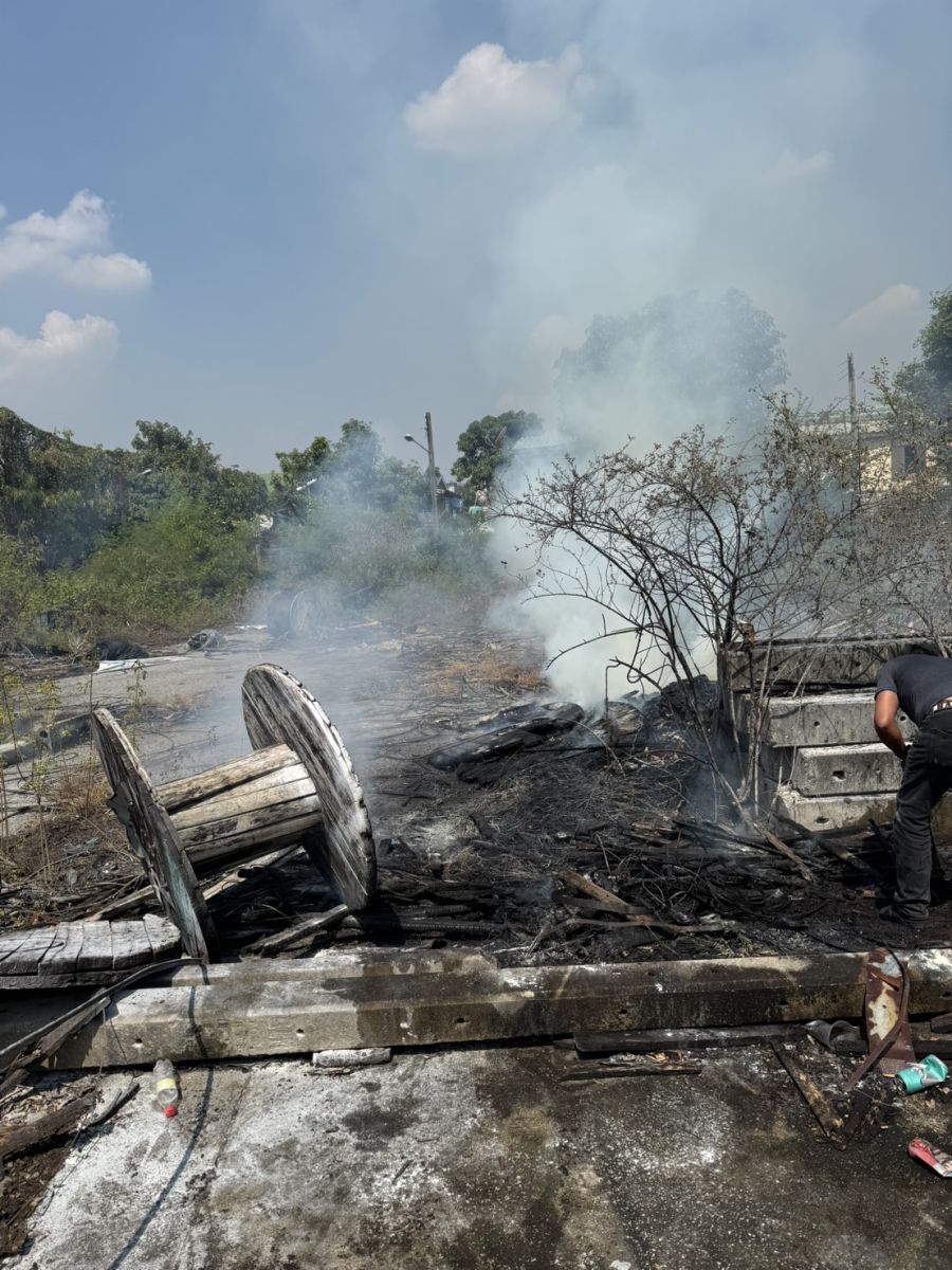 เวลา 11.43 น. เจ้าหน้าที่สถานีดับเพลิงและกู้ภัยพระโขนง,สุขุมวิท ถึงที่เกิดเหตุ ตรวจสอบแล้วเป็นกองสายเคเบิ้ลและกองวัสดุ ห่างไกลบ้านเรือนประชาชน เจ้าหน้าที่อยู่ระหว่างใช้น้ำทำการดับ