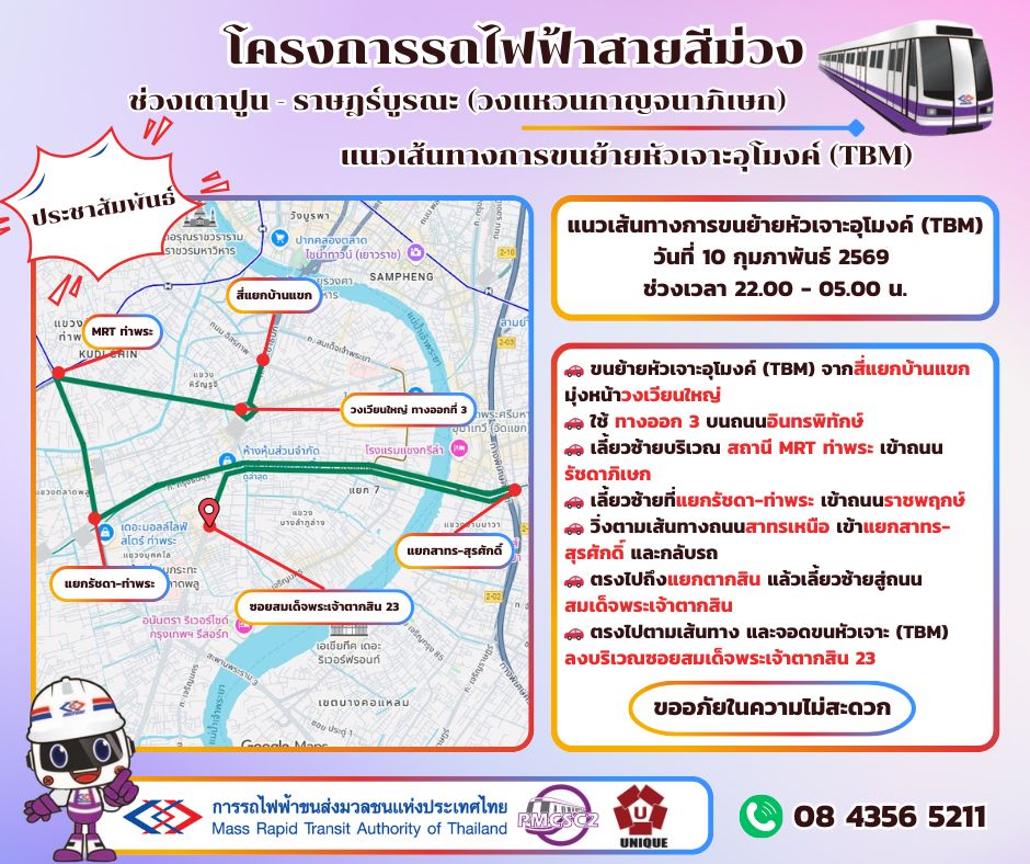 วันที่ 10 กุมภาพันธ์ 2569 ช่วงเวลา 22.00 - 05.00 น. ขนย้ายหัวเจาะอุโมงค์ (TBM) จากสี่แยกบ้านแขก มุ่งหน้าวงเวียนใหญ่ ใช้ ทางออก 3 บนถนนอินทรพิทักษ์ เลี้ยวซ้ายบริเวณ สถานี MRT ท่าพระ เข้าถนนรัชดาภิเษก เลี้ยวซ้ายที่แยกรัชดา-ท่าพระ เข้าถนนราชพฤกษ์ วิ่งตามเส้นทางถนนสาทรเหนือ เข้าแยกสาทร-สุรศักดิ์ และกลับรถ ตรงไปถึงแยกตากสิน แล้วเลี้ยวซ้ายสู่ถนนสมเด็จพระเจ้าตากสิน ตรงไปตามเส้นทาง และจอดขนหัวเจาะ (TBM)ลงบริเวณซอยสมเด็จพระเจ้าตากสิน 23