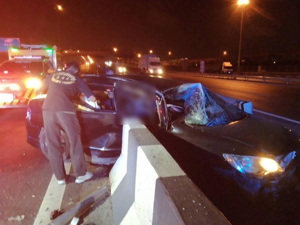 รถนั่งส่วนบุคคลเสียหลักชนขอบทาง ถนนมอเตอร์เวย์ (ทล.7) กม.10 มีทั้งผู้บาดเจ็บและผู้เสียชีวิต