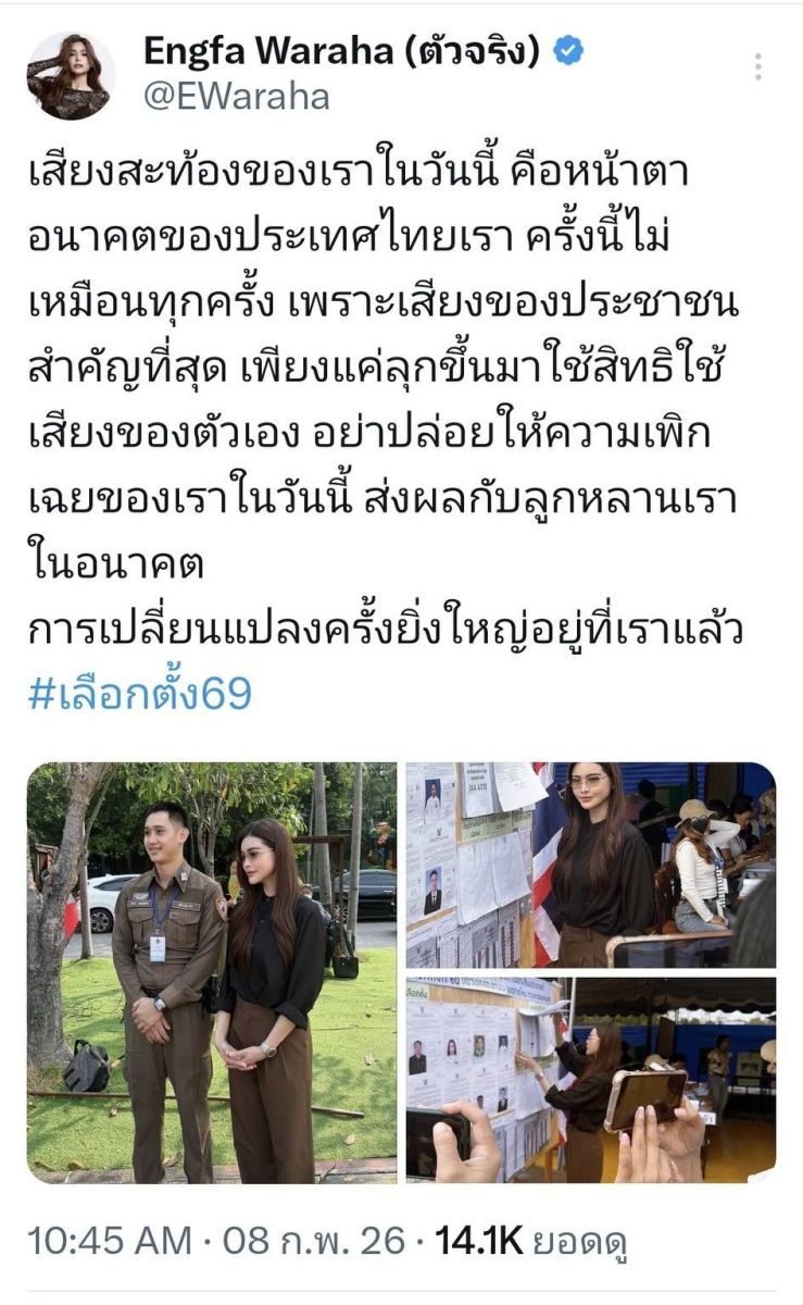 พร้อมทั้งโพสต์ใน X :Engfa Waraha(ตัวจริง) เชิญชวนให้ทุกคนออกมาใช้สิทธิ์ ข้อความว่า