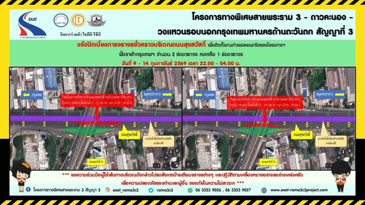 การทางพิเศษแห่งประเทศไทย (กทพ.) กระทรวงคมนาคม ได้ว่าจ้าง กิจการร่วมค้า ไอทีดี-วีซีบี เป็นผู้รับจ้างดำเนินการก่อสร้างโครงการทางพิเศษสายพระราม 3 - ดาวคะนอง - วงแหวนรอบนอกกรุงเทพมหานครด้านตะวันตก สัญญาที่ 3 โดยผู้รับจ้างจะดำเนินการติดตั้งงานกำแพงคอนกรีตของโครงการทางพิเศษดังกล่าว จึงมีความจำเป็นจะต้องปิดเบี่ยงการจราจรชั่วคราวบริเวณถนนสุขสวัสดิ์ ฝั่งขาเข้ากรุงเทพมหานคร จำนวน 2 ช่องจราจร คงเหลือ 1 ช่องจราจร ตั้งแต่วันที่ 9 - 14 กุมภาพันธ์ 2569 ช่วงเวลา 22.00 - 04.00 น. และเพื่อความปลอดภัย ผู้รับจ้างได้จัดเจ้าหน้าที่อำนวยความสะดวกด้านการจราจรตลอดเวลา และได้ทำการติดตั้งป้ายแจ้งเตือนก่อนถึงพื้นที่ก่อสร้างและติดตั้งไฟสัญญาณไฟจราจรต่าง ๆ ป้ายประชาสัมพันธ์การเบี่ยงจราจรพร้อมไฟวับวาบ เพื่อให้ผู้ใช้เส้นทางได้ทราบ