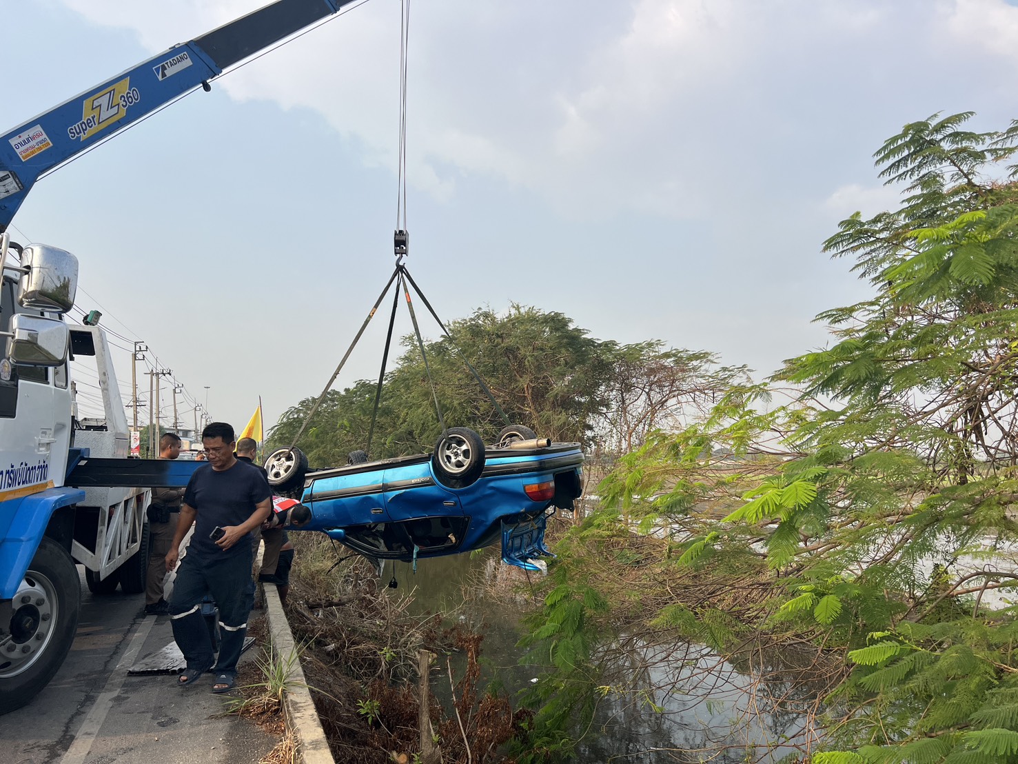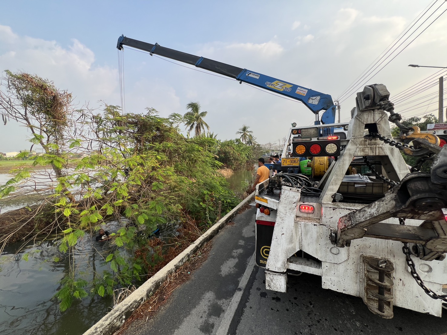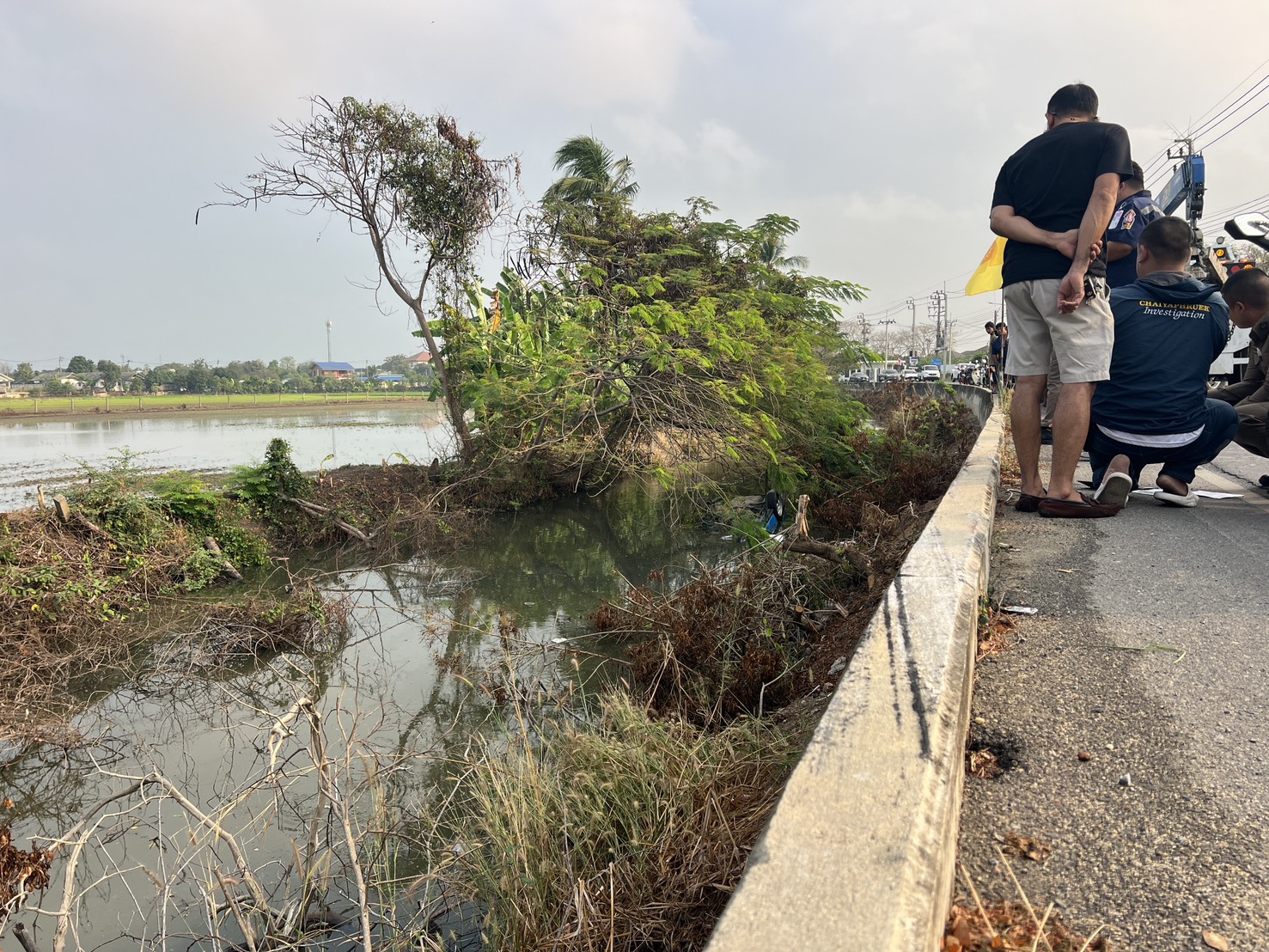 ที่เกิดเหตุพบรถยนต์เก๋ง ยี่ห้อ โตโยต้า สีน้ำเงิน ทะเบียน กทม. จมอยู่ในน้ำตัวรถลักษณะพลิกคว่ำล้อชี้ฟ้า ทางเจ้าหน้าที่ได้ใช้รถยกยกตัวรถขึ้นมาเพื่อตรวจสอบพบภายในรถมีผู้เสียชีวิต 1 ราย เป็นชาย อายุ 46 ปีชาว จ. สกลนคร ขณะเดียวกันเจ้าหน้าที่ยังพบร่องรอยขูดที่ขอบทางด้วย