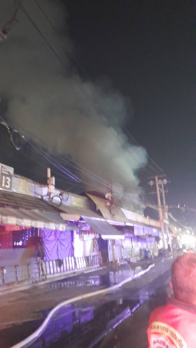เวลา 23.06 น. ขณะนี้สามารถควบคุมเพลิงได้ ลักษณะที่เกิดเหตุเป็นร้านค้าจำหน่ายเสื้อผ้า เบื้องต้นเพลิงลุกไหม้เสียหายประมาณ 8 ห้อง