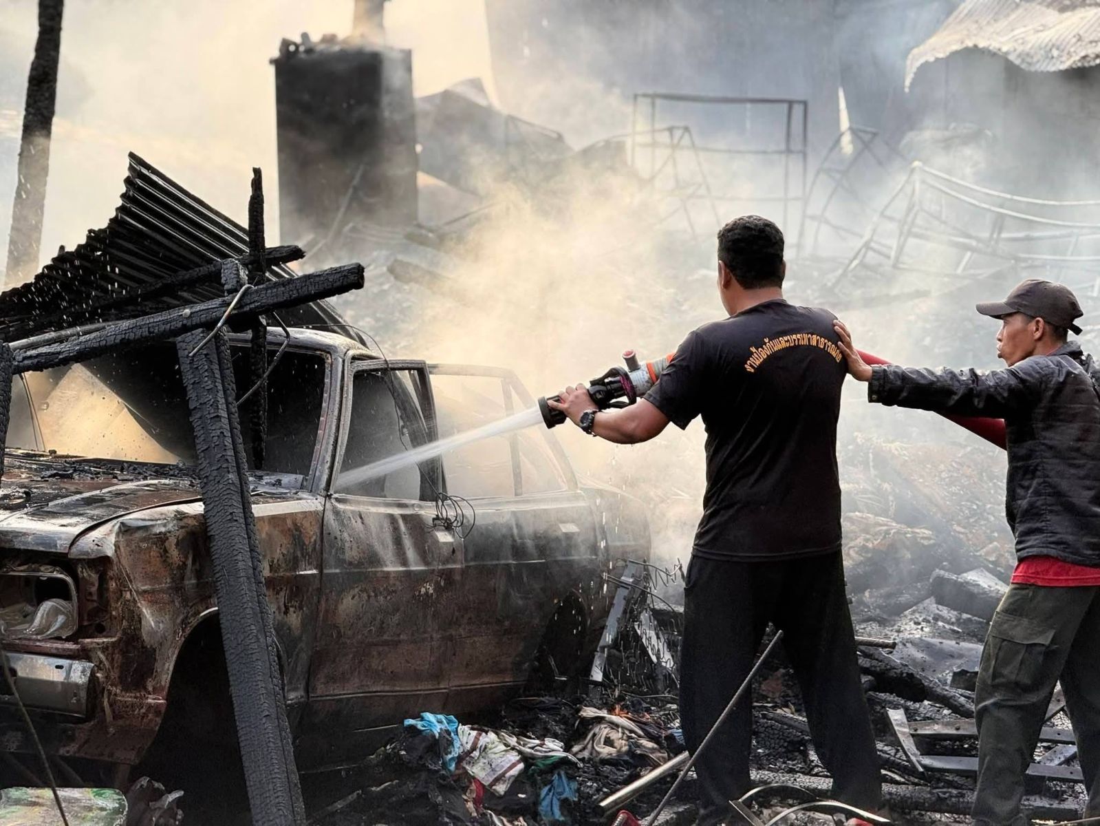 ด้านเจ้าหน้าที่ป้องกันและบรรเทาสาธารณภัย เทศบาลเมืองสุไหงโก-ลก ได้ระดมรถน้ำและกำลังพลเข้าฉีดสกัดเพลิงอย่างเต็มกำลัง จนสามารถควบคุมสถานการณ์ไว้ได้ในเวลาต่อมา เพื่อป้องกันไม่ให้ไฟลุกลามไปยังบ้านเรือนใกล้เคียง ขณะที่เจ้าหน้าที่มูลนิธิเซิ่งหมู่ธารน้ำใจสุไหงโก-ลก ได้นำผู้ได้รับบาดเจ็บทั้ง 3 ราย ส่งรักษาต่อที่โรงพยาบาลสุไหงโก-ลก