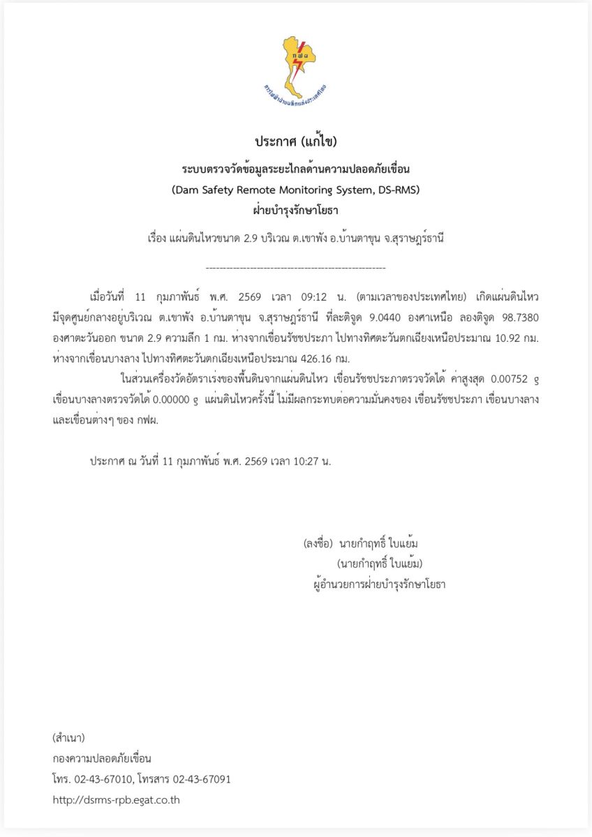 การไฟฟ้าฝ่ายผลิตแห่งประเทศไทย (กฟผ.) เปิดเผยว่าเมื่อวันที่ 11 กุมภาพันธ์ พ.ศ.2569 เวลา 09.12 น ตามเวลาของประเทศไทย เกิดแผ่นดินไหวโดยมีจุดศูนย์กลางอยู่บริเวณตำบลเขาพัง อำเภอบ้านตาขุน จังหวัดสุราษฎร์ธานีที่ละติจูด 9.0440 องศาเหนือ ลองติจูด 98.7380 องศาตะวันออก ขนาด 2.9 ความลึก 1 กม.ห่างจากเขื่อนรัชชประภา ไปทางทิศตะวันตกเฉียงเหนือประมาณ 10.92 กม. ห่างจากเขื่อนบางลางไปทางทิศตะวันตกเฉียงเหนือประมาณ 426.16 กม
