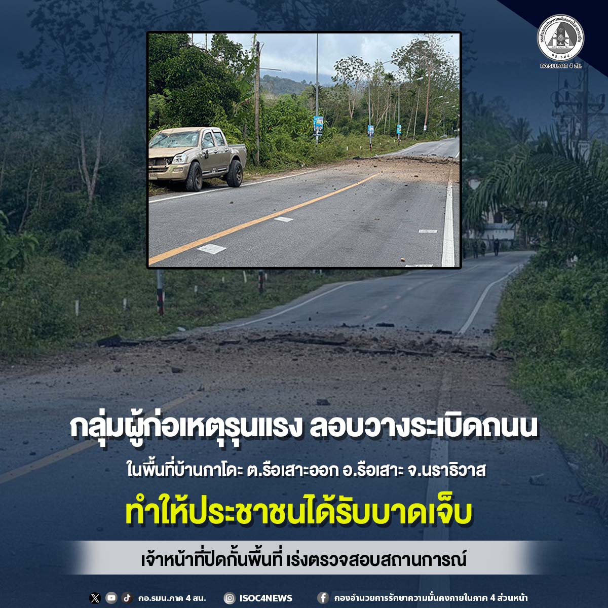 เมื่อเวลา 15.19 น. วันที่ 11 กุมภาพันธ์ 2569 เกิดเหตุลอบวางระเบิดในพื้นที่บ้านกาโดะ หมู่ 4 ตำบลรือเสาะออก อำเภอรือเสาะ จังหวัดนราธิวาส ส่งผลให้ชาวบ้านที่ขับรถกระบะ ผ่านจุดเกิดเหตุ ได้รับบาดเจ็บ 3 ราย ชาย อายุ 43 ปี (ผู้ขับขี่) ชาย อายุ 67 ปี และหญิง อายุ 73 ปี