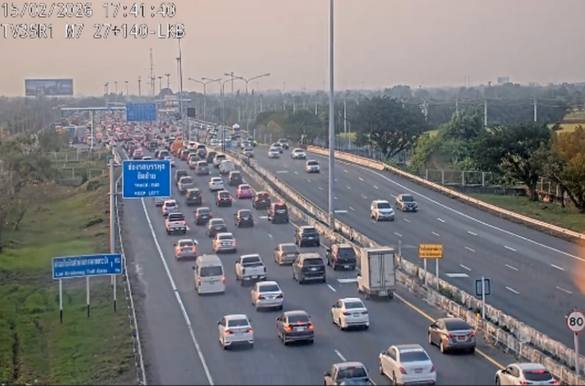 ขณะที่สภาพการจราจร ถนนมอเตอร์เวย์ ฝั่งขาเข้า ที่จะมุ่งหน้าเข้าด่านลาดกระบัง การจราจรหนาแน่นเคลื่อนตัวช้า