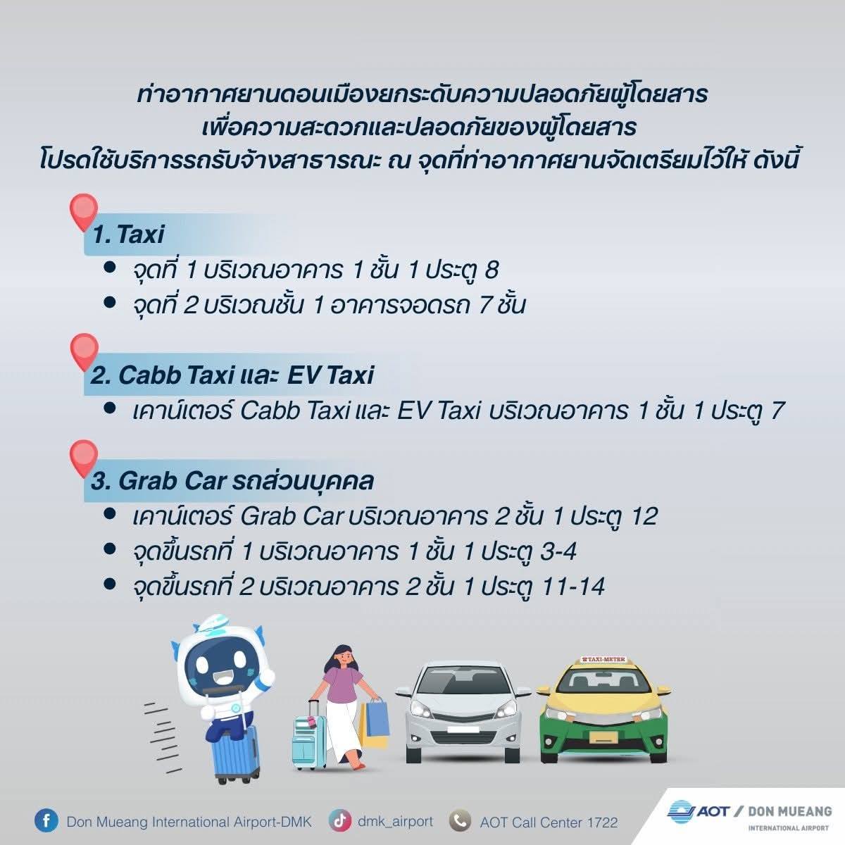 ตั้งแต่วันที่ 1 มีนาคม 2569 เป็นต้นไป ท่าอากาศยานดอนเมือง (ทดม.) เข้มงวดมาตรการควบคุมกำกับดูแลรถรับจ้างสาธารณะที่ไม่มีผู้โดยสารเข้ามาภายในพื้นที่ท่าอากาศยาน ยกเว้นผู้ที่ได้รับอนุญาตจาก ทดม. เพื่อความเป็นระเบียบและการป้องกันความเสี่ยงต่อความปลอดภัยของผู้เดินทาง