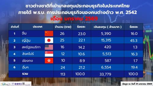 นายพูนพงษ์ นัยนาภากรณ์ อธิบดีกรมพัฒนาธุรกิจการค้า กระทรวงพาณิชย์ ในฐานะเลขานุการคณะกรรมการการประกอบธุรกิจของคนต่างด้าว เปิดเผยว่า การลงทุนเดือนแรกของปี 2569 มีการอนุญาตให้คนต่างชาติเข้ามาลงทุนประกอบธุรกิจในประเทศไทย ภายใต้พระราชบัญญัติการประกอบธุรกิจของคนต่างด้าว พ.ศ. 2542 จำนวน 113 ราย โดยเป็นการลงทุนผ่านช่องทางการขอรับใบอนุญาตประกอบธุรกิจของคนต่างด้าว 24 ราย และการขอหนังสือรับรองการประกอบธุรกิจของคนต่างด้าว (ผ่านช่องทางการลงทุนตามกฎหมายว่าด้วยการส่งเสริมการลงทุน หรือได้รับอนุญาตตามกฎหมายว่าด้วยการนิคมอุตสาหกรรมแห่งประเทศไทย และการใช้สิทธิตามสนธิสัญญาหรือความตกลงระหว่างประเทศ) 89 ราย มูลค่าเงินลงทุนรวมทั้งสิ้น 33,779 ล้านบาท โดยมีจำนวนชาวต่างชาติที่เข้ามาลงทุน 5 อันดับแรก ได้แก่