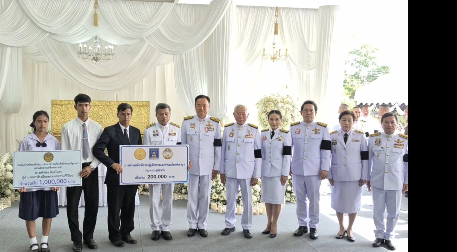 โอกาสนี้ นายกรัฐมนตรีและรัฐมนตรีว่าการกระทรวงมหาดไทย มอบเงินกองทุนเงินช่วยเหลือผู้ประสบสาธารณภัย สำนักนายกรัฐมนตรี จำนวน 1,000,000 บาท และเงินช่วยเหลือเยียวยาผู้เสียหายและจำเลยในคดีอาญา กระทรวงยุติธรรม จำนวน 200,000 บาท