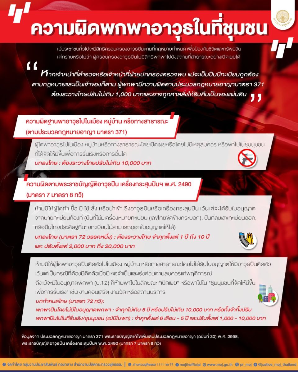 พกพาปืนไปในที่รื่นเริง/ชุมนุมชน (แม้มีใบพก) : จำคุกตั้งแต่ 6 เดือน - 5 ปี และปรับตั้งแต่ 1,000 - 10,000 บาท