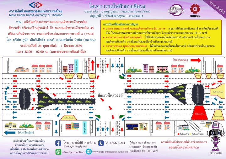 การรถไฟฟ้าขนส่งมวลชนแห่งประเทศไทย (รฟม.) แจ้งว่า บริษัท ยูนิค เอ็นจิเนียริ่ง แอนด์ คอนสตรัคชั่น จำกัด (มหาชน) ผู้รับจ้างงานออกแบบและก่อสร้างอุโมงค์ทางวิ่งและสถานีใต้ดิน โครงการรถไฟฟ้าสายสีม่วง ช่วงเตาปูน - ราษฎร์บูรณะ (วงแหวนกาญจนาภิเษก) สัญญาที่ 4 ช่วงสะพานพุทธ - ดาวคะนอง มีความจำเป็นต้องปิดเบี่ยงจราจรบนถนนสมเด็จพระเจ้าตากสิน ฝั่งขาเข้า บริเวณบ้านอู่รถทัวร์ ถึง ซอยสมเด็จพระเจ้าตากสิน 38 เพื่องานคืนผิวจราจร งานก่อสร้างปล่องระบายอากาศที่ 3 (VS03) ระหว่างวันที่ 24 กุมภาพันธ์ - 1 มีนาคม 2569 เวลา 23.00 - 02.00 น. (เฉพาะช่วงกลางคืนเท่านั้น) โดยมีการปรับเปลี่ยนเส้นทางการสัญจร ดังนี้