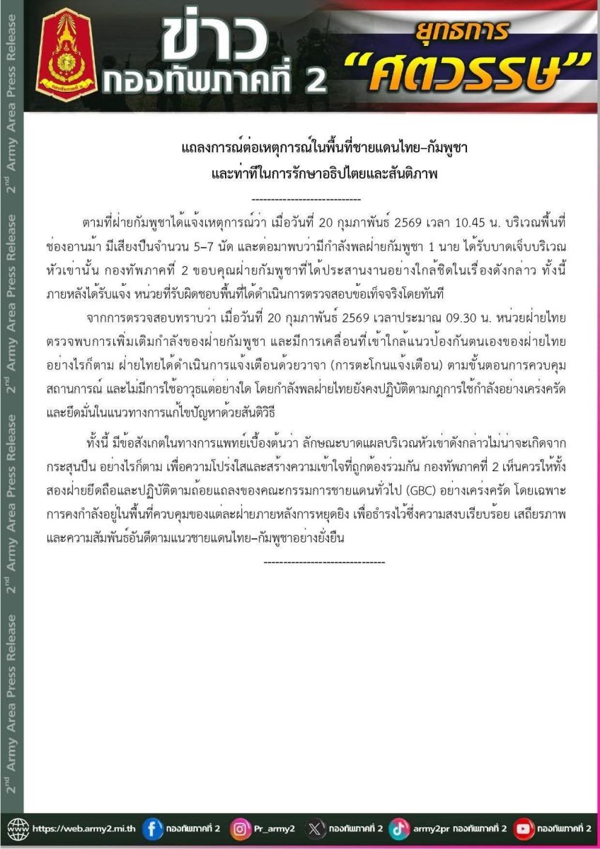 ตามที่ฝ่ายกัมพูชาได้แจ้งเหตุการณ์ว่า เมื่อวันที่ 20 กุมภาพันธ์ 2569 เวลา 10.45 น. บริเวณพื้นที่ช่องอานม้า มีเสียงปืนจำนวน 5–7 นัด และต่อมาพบว่ามีกำลังพลฝ่ายกัมพูชา 1 นาย ได้รับบาดเจ็บบริเวณหัวเข่านั้น กองทัพภาคที่ 2 ขอบคุณฝ่ายกัมพูชาที่ได้ประสานงานอย่างใกล้ชิดในเรื่องดังกล่าว ทั้งนี้ ภายหลังได้รับแจ้ง หน่วยที่รับผิดชอบพื้นที่ได้ดำเนินการตรวจสอบข้อเท็จจริงโดยทันที