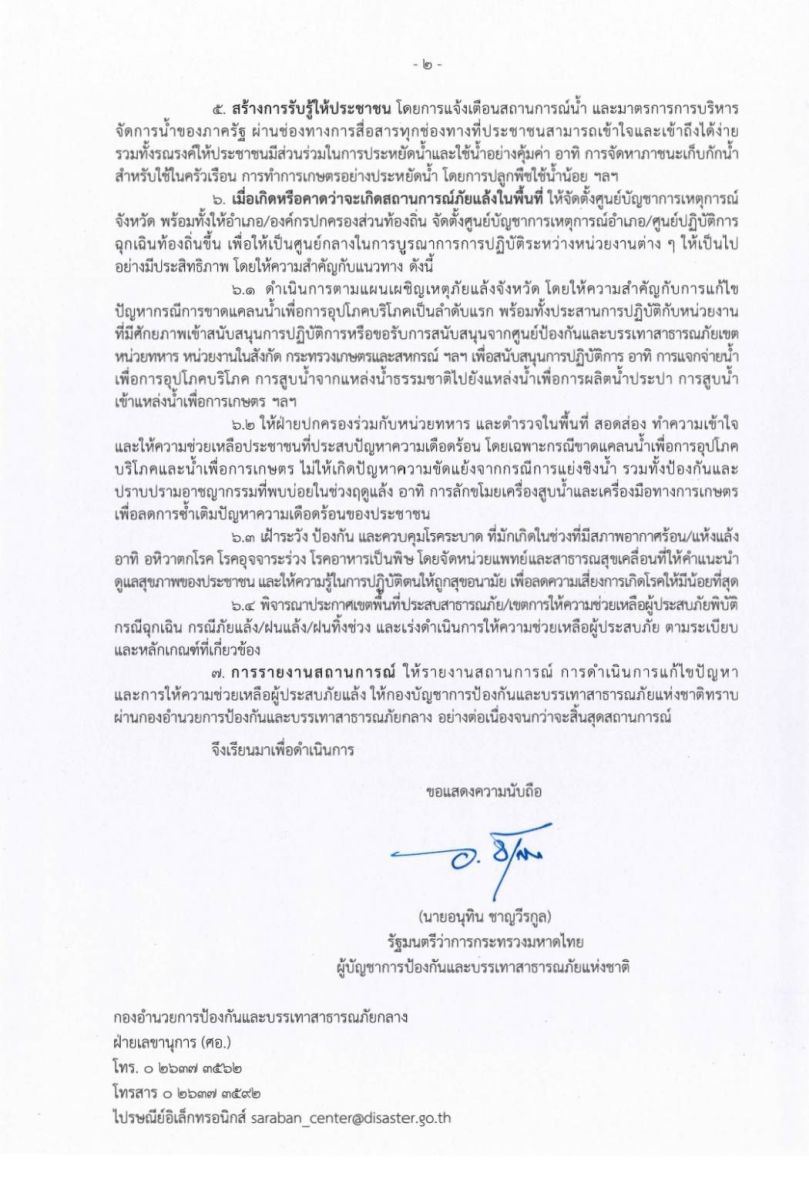 2. "เร่งจัดทำแผนเผชิญเหตุภัยแล้งจังหวัด" ให้สอดคล้องกับสถานการณ์จริง มีการซักซ้อมความเข้าใจแนวทางปฏิบัติร่วมกับหน่วยงานที่เกี่ยวข้อง ทั้งฝ่ายพลเรือน ทหาร และภาคเอกชน เพื่อให้การเข้าช่วยเหลือเมื่อเกิดเหตุเป็นไปอย่างรวดเร็วและเป็นระบบ