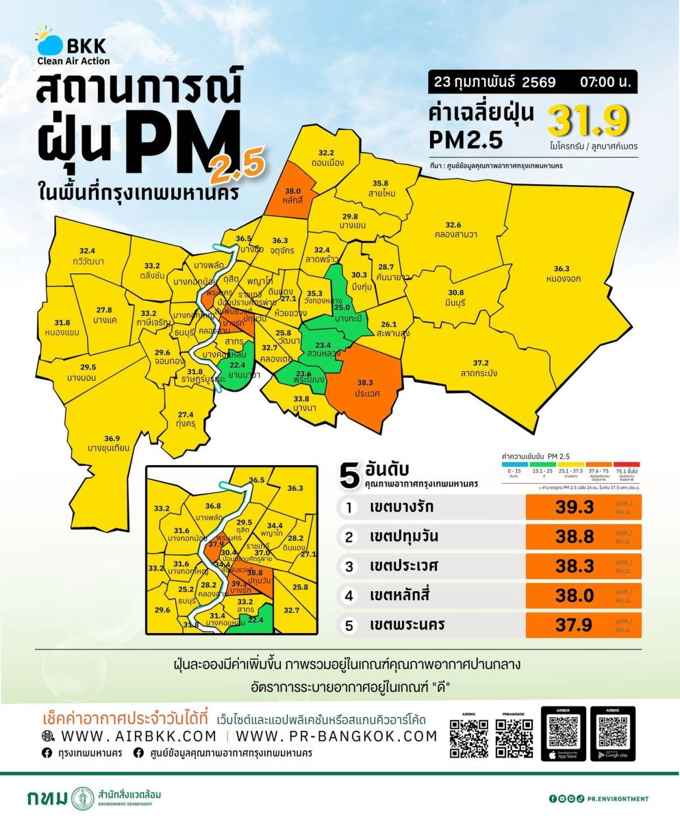 ศูนย์ข้อมูลคุณภาพอากาศกรุงเทพมหานคร รายงานสถานการณ์ฝุ่นละอองขนาดไม่เกิน 2.5 ไมครอน (PM 2.5) ในกรุงเทพมหานคร ประจำวันที่ 23 กุมภาพันธ์ 2569 เวลา 07.00 น. ค่าเฉลี่ยของกรุงเทพมหานคร 31.9 ไมโครกรัมต่อลูกบาศก์เมตร (มคก./ลบ.ม.) (ค่ามาตรฐานไม่เกิน 37.5 มคก./ลบ.ม.)