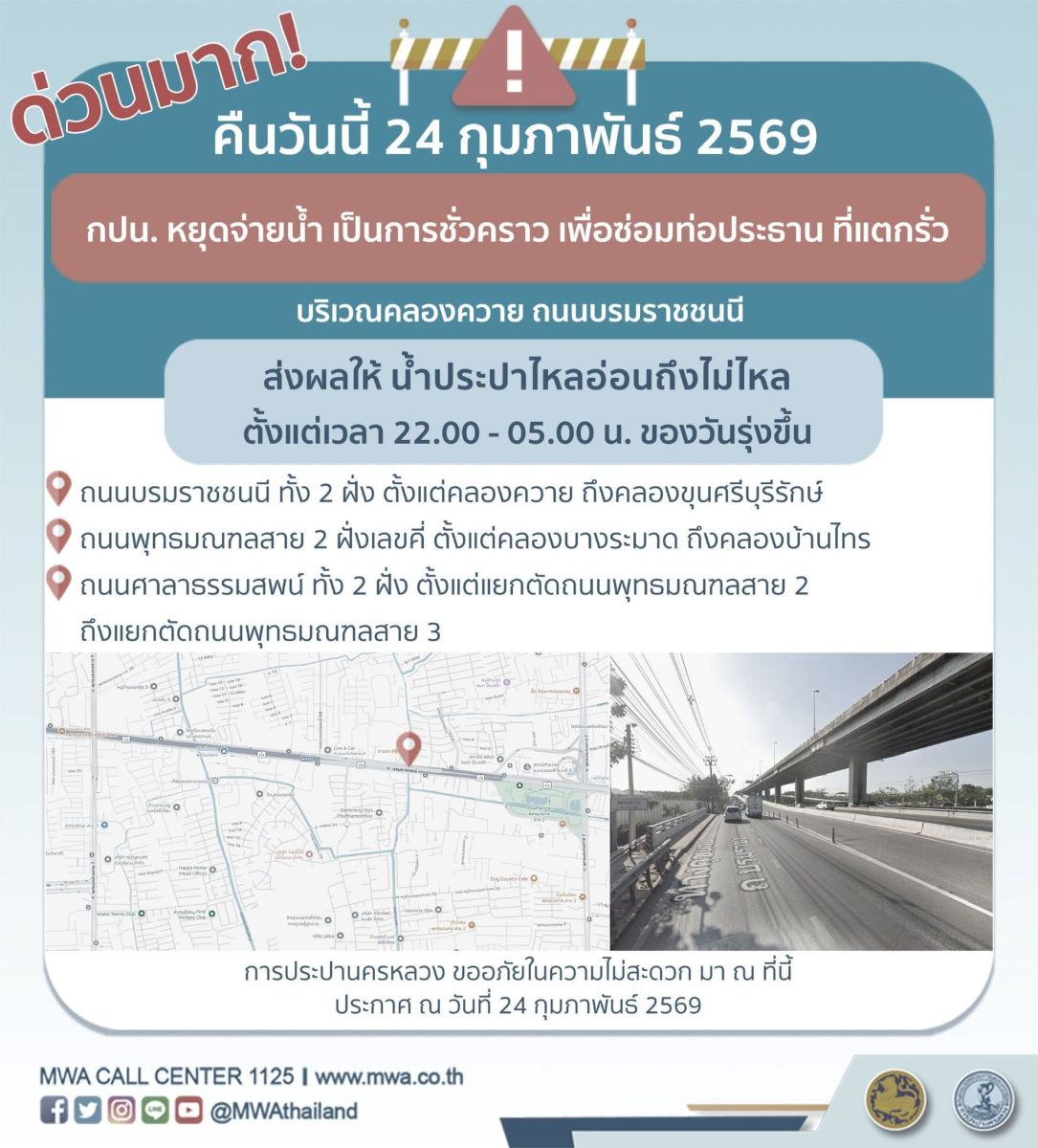 การประปานครหลวง (กปน.) ขอแจ้งให้ทราบว่า จะดำเนินการซ่อมท่อประธาน ที่แตกรั่ว เป็นกรณีเร่งด่วน ในพื้นที่บริเวณคลองควาย ถนนบรมราชชนนี เพื่อให้ประชาชนได้รับบริการน้ำประปาอย่างเพียงพอและทั่วถึง จึงมีความจำเป็นต้องหยุดจ่ายน้ำ เป็นการชั่วคราว ในคืนวันนี้ (วันอังคารที่ 24 กุมภาพันธ์ 2569) ตั้งแต่เวลา 22.00 - 05.00 น. ของวันรุ่งขึ้น โดยระหว่างดำเนินการ ส่งผลให้ น้ำประปาไหลอ่อนถึงไม่ไหล ในพื้นที่ดังต่อไปนี้