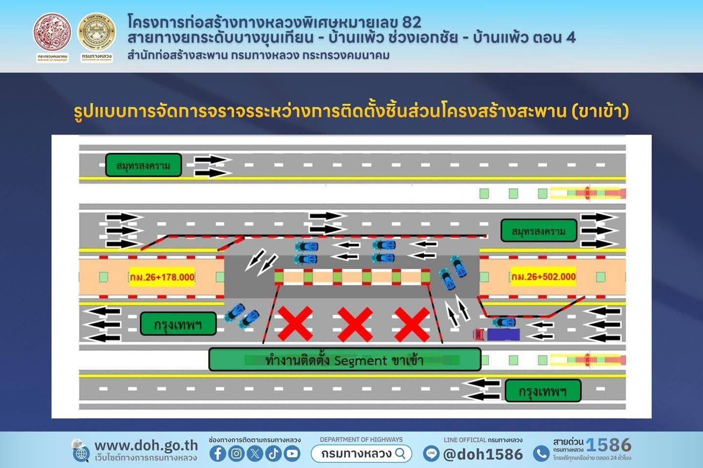 สำนักก่อสร้างสะพาน กรมทางหลวง ขอแจ้งประชาสัมพันธ์การปรับเบี่ยงการจราจรบนทางหลวงหมายเลข 35 (ถนนพระราม 2) บริเวณช่วง กม.26+178 ถึง กม.26+502 และสะพานกลับรถที่ กม.26 ฝั่งขาเข้ากรุงเทพ เพื่อดำเนินการติดตั้งชิ้นส่วนโครงสร้างโครงการทางหลวงพิเศษหมายเลข 82 (M82) สายทางยกระดับบางขุนเทียน – บ้านแพ้ว (ตอน 4) ตามแผนงานก่อสร้าง