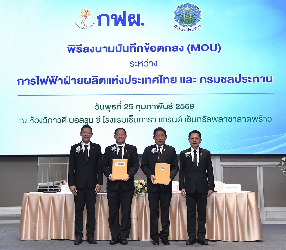 วันนี้ (25 กุมภาพันธ์ 2569) การไฟฟ้าฝ่ายผลิตแห่งประเทศไทย (กฟผ.) ลงนาม 3 บันทึกข้อตกลงกับกรมชลประทาน ได้แก่ 1) โครงการโรงไฟฟ้าพลังน้ำท้ายเขื่อนชลประทาน เขื่อนลำปาว (จ.กาฬสินธุ์) เขื่อนลำตะคอง (จ.นครราชสีมา) เขื่อนกระเสียว (จ.สุพรรณบุรี) และเขื่อนห้วยแม่ท้อ (จ.ตาก) 2) โครงการโรงไฟฟ้าพลังน้ำท้ายเขื่อนชลประทาน เขื่อนแก่งกระจาน (จ.เพชรบุรี) และเขื่อนแม่งัดสมบูรณ์ชล (จ.เชียงใหม่) และ 3) โครงการวิจัยและพัฒนาการบริหารจัดการน้ำ โดยมี นายนรินทร์ เผ่าวณิช ผู้ว่าการ กฟผ. และนายสุริยพล นุชอนงค์ อธิบดีกรมชลประทาน เป็นตัวแทนลงนาม พร้อมด้วย นายวิภู พิวัฒน์ รองผู้ว่าการผลิตไฟฟ้า นายศิริวัฒน์ เจ็ดสี รองผู้ว่าการพัฒนาโรงไฟฟ้าและพลังงานหมุนเวียน กฟผ. และนายเดช เล็กวิชัย รองอธิบดีฝ่ายบำรุงรักษา กรมชลประทาน ร่วมเป็นสักขีพยาน ณ โรงแรมเซ็นทารา แกรนด์ เซ็นทรัลพลาซ่า ลาดพร้าว กรุงเทพฯ