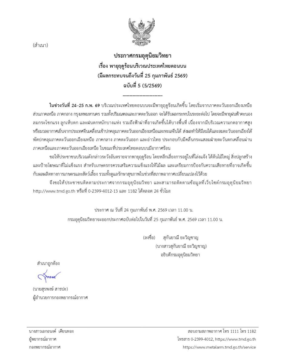 ประกาศกรมอุตุนิยมวิทยา พายุฤดูร้อนบริเวณประเทศไทยตอนบน (มีผลกระทบจนถึงวันที่ 25 กุมภาพันธ์ 2569) ฉบับที่ 7 (7/2569) ประเทศไทยตอนบนมีพายุฤดูร้อนเกิดขึ้น โดยมีลักษณะของพายุฝนฟ้าคะนอง ลมกระโชกแรง ลูกเห็บตก และฝนตกหนักบางแห่ง รวมถึงฟ้าผ่าที่อาจเกิดขึ้นได้บางพื้นที่ เนื่องจากบริเวณความกดอากาศสูงหรือมวลอากาศเย็นจากประเทศจีนปกคลุมด้านตะวันออกของภาคตะวันออกเฉียงเหนือและทะเลจีนใต้ ส่งผลทำให้มีลมใต้และลมตะวันออกเฉียงใต้พัดนำความชื้นเข้ามาปกคลุมภาคตะวันออกเฉียงเหนือ ภาคกลาง ภาคตะวันออก และอ่าวไทย ประกอบกับคลื่นกระแสลมฝ่ายตะวันตกจากประเทศเมียนมาเคลื่อนเข้าปกคลุมภาคเหนือและภาคตะวันออกเฉียงเหนือตอนบน ในขณะที่ประเทศไทยตอนบนมีอากาศร้อน