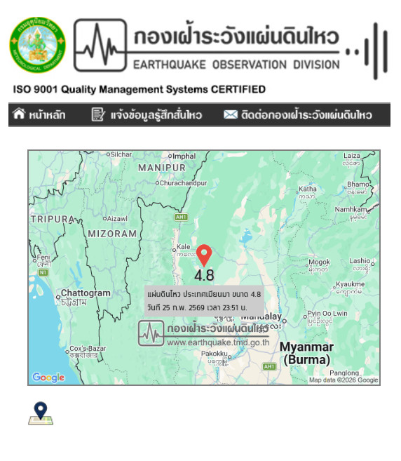 วันที่ 25 กุมภาพันธ์ 2569 เวลา 23.51 น. กองเฝ้าระวังแผ่นดินไหว กรมอุตุนิยมวิทยา แจ้งเหตุ แผ่นดินไหว ขนาด 4.8 ความลึก 165 กม. ภายในพื้นที่ของประเทศเมียนมา (22.88°N,94.58°E) ศูนย์กลางห่างออกไป ทางทิศตะวันตกเฉียงเหนือของ อ.เมือง จ.แม่ฮ่องสอน ประมาณ 532 กม. ยังไม่มีรายงานผลกระทบต่อประเทศไทย